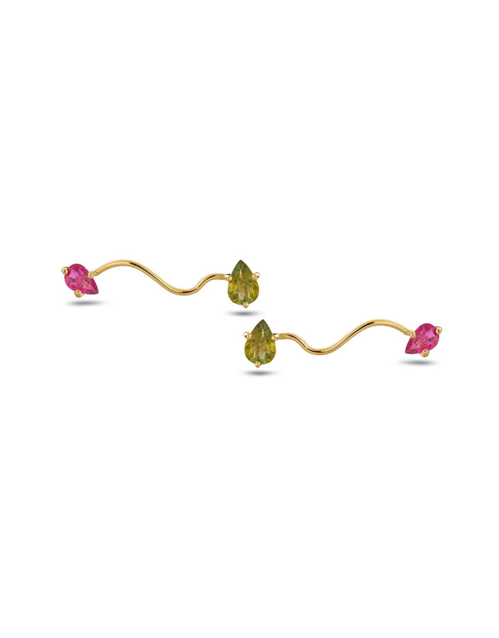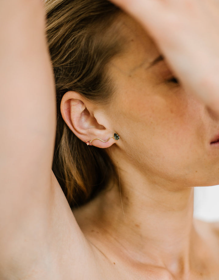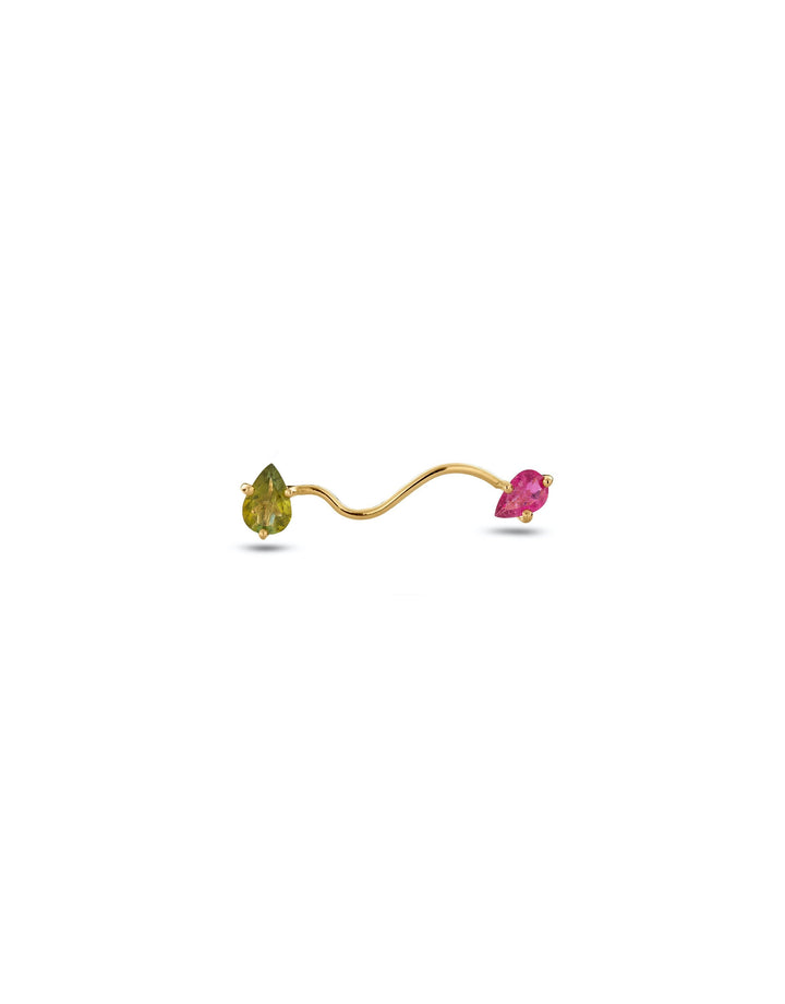 Natalie Schayes has designed her iconic Eloise earring and set it with two tourmalines (green and pink). Her love of stones is represented through this earring where they are at the heart of the creation. Made of two colors, this singular and modern piece dresses the one who wears it. Wear this model as a pair or as a mono earring. Sold individually.