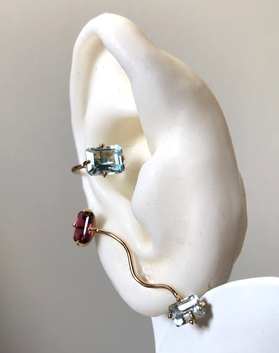 Natalie Schayes has designed her iconic Eloise earring and set it with a rhodolite and an aquamarine. Her love of stones is represented through this earring where they are at the heart of the creation. Made of two colors, this singular and modern piece dresses the one who wears it. Wear this model as a pair or as a mono earring. Sold individually.