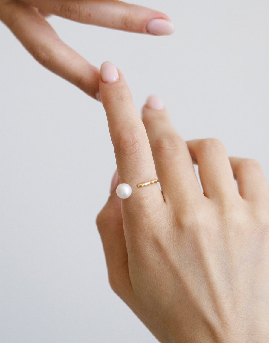 For her Signature collection, Natalie Schayes has designed a ring set with an off-center pearl that fits perfectly between the fingers. The designer likes using the pearl in a modern way in order to make it ultra-desirable. The colour and light of the white pearl will illuminate your hand.