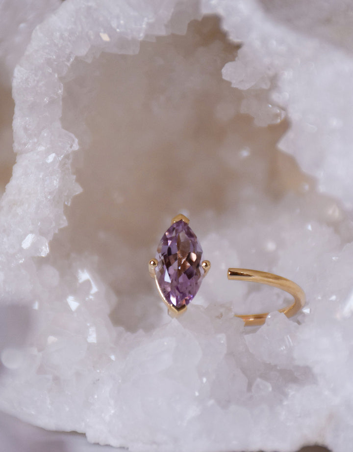For her Signature collection, Natalie Schayes has imagined a ring with an off-center marquise-shaped amethyst stone that fits perfectly between the fingers. The stones are placed where you wouldn't expect them to be, giving the illusion of a stone that levitates. This precious ring can be perfect as a modern engagement ring. Wear the stone on one side of the finger or the other but always between the two fingers.