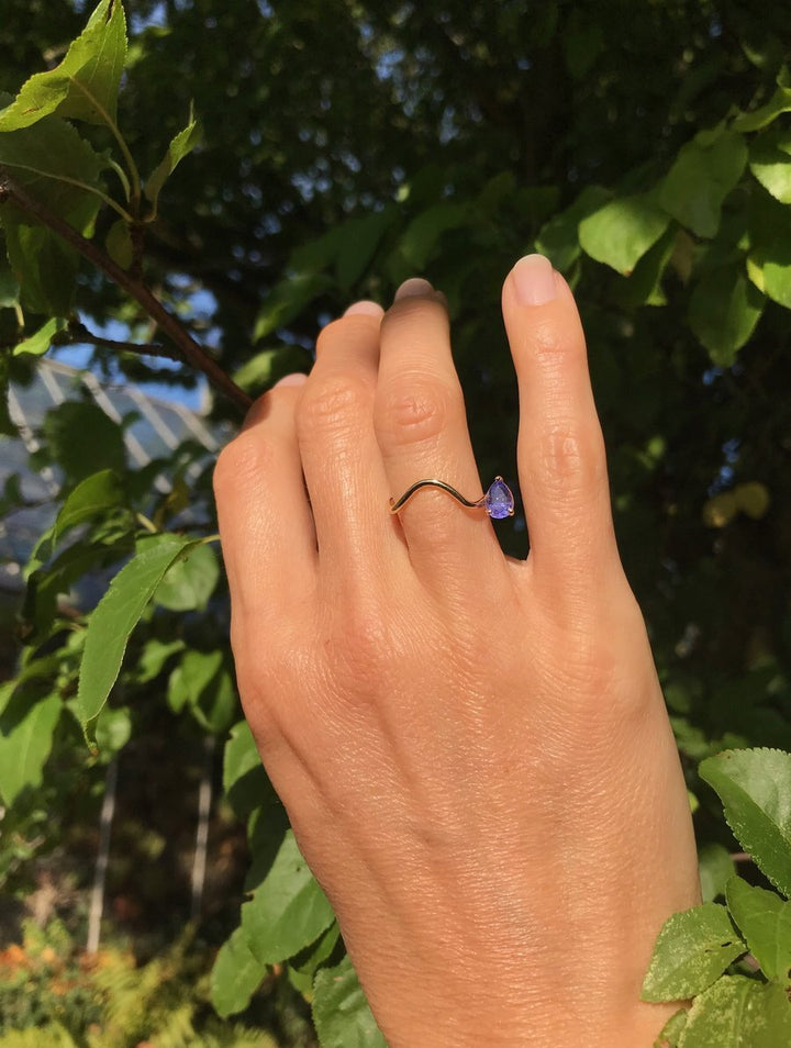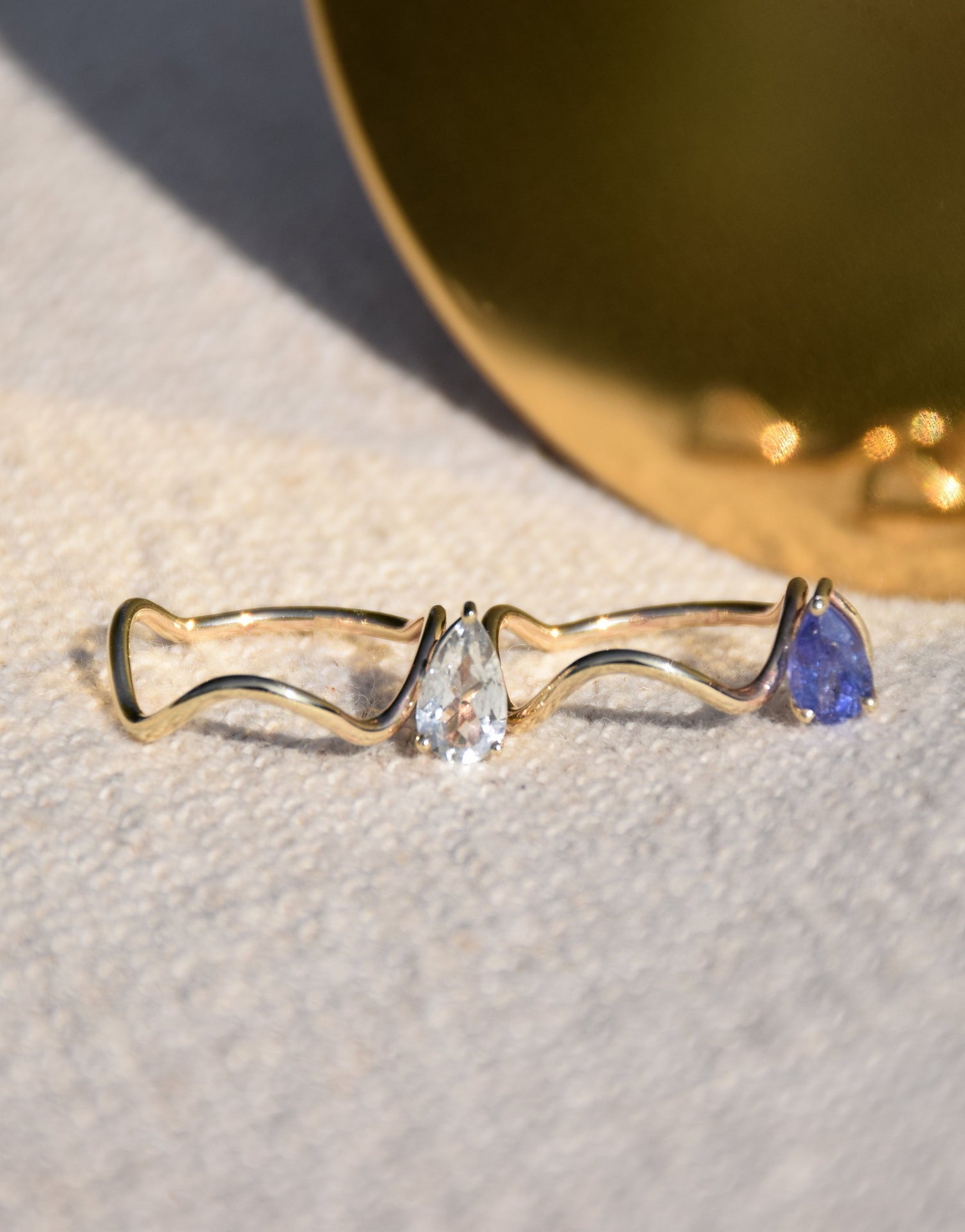 For her Path of Life collection, Natalie Schayes has designed an 9k yellow gold ring set with a semi-precious stone, a blue tanzanite. The designer imagined a precious and wavy beauty with a singular stone that appears to be floating. As a new and contemporary version of the solitaire ring, you can wear the stone on both sides of the finger for a different look. This minimal ring can be perfect as a modern engagement ring.