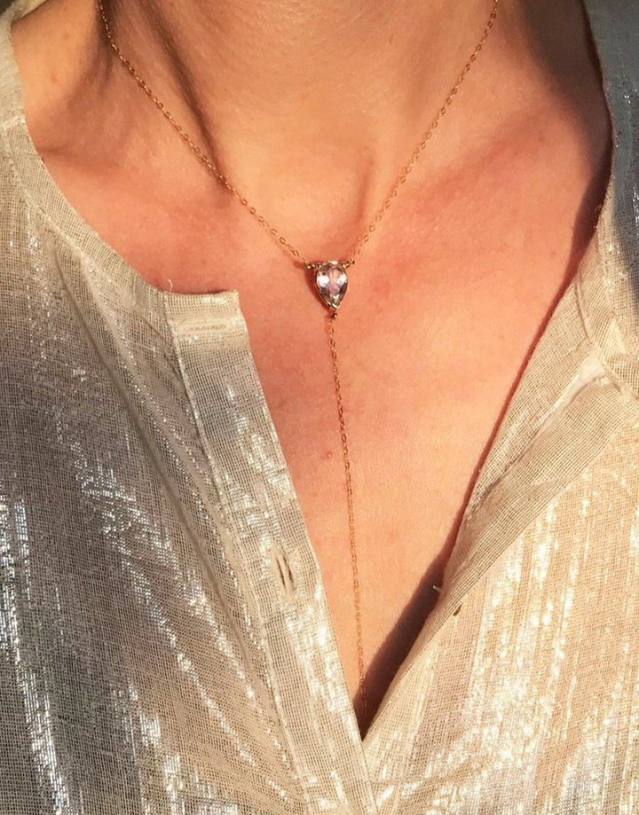 For her Signature collection, Natalie Schayes has designed a modern necklace set with an amethyst stone. This refined necklace embraces your neckline and falls to add a sensual touch to your look. The designer imagined a minimalist yet strong necklace to wear on a basic top everyday or for a special occasion.