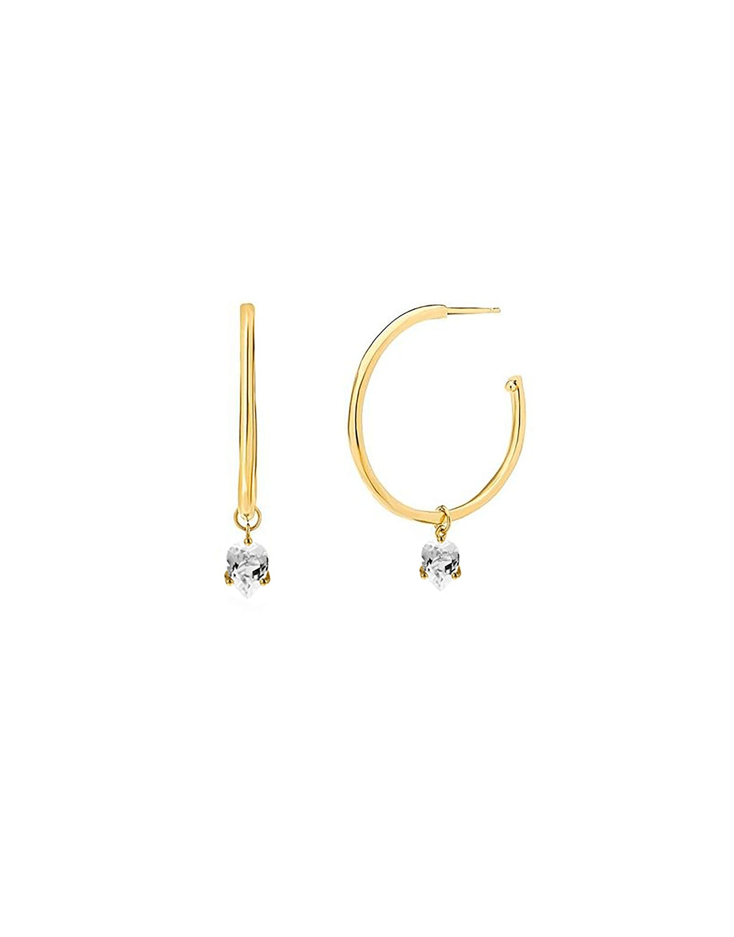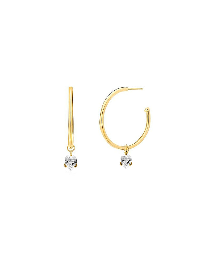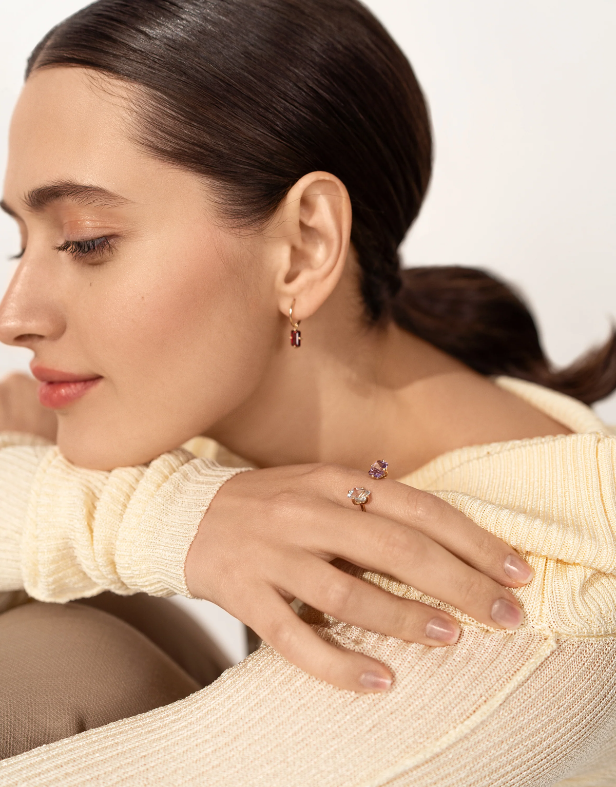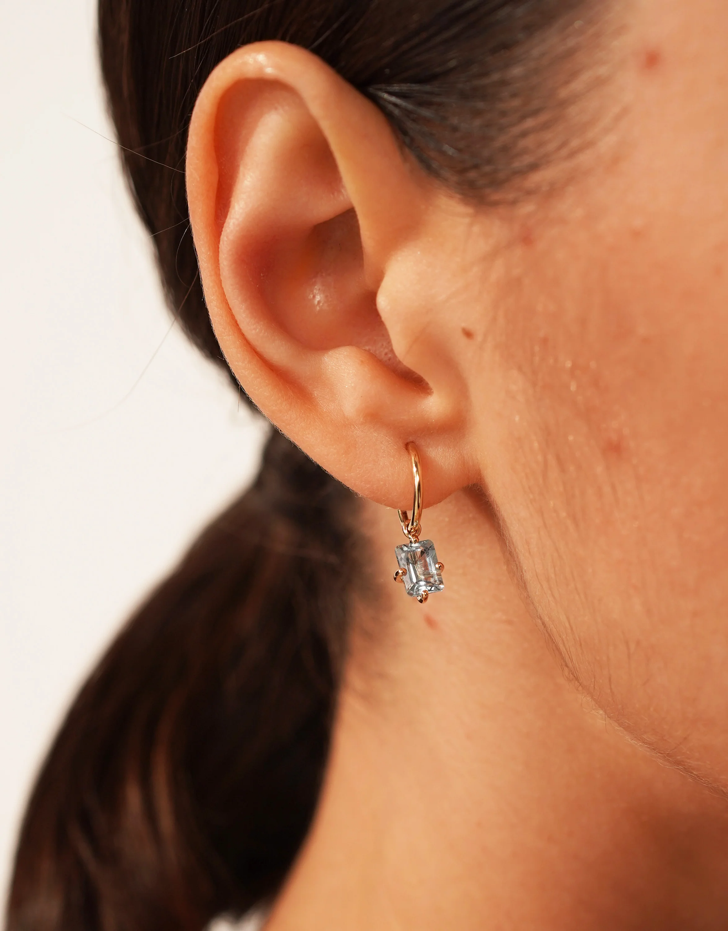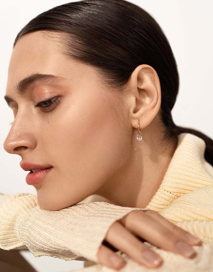 For her Signature collection, Natalie Schayes has designed a creole earring set with its recognizable pear or octogone shaped stone. As the perfect minimalist jewel, the designer imagined an earring to be worn everyday. The earring falls gently from the ear and accentuated the neck with the stone at the end. Wear this model as a pair or as a mono earring.