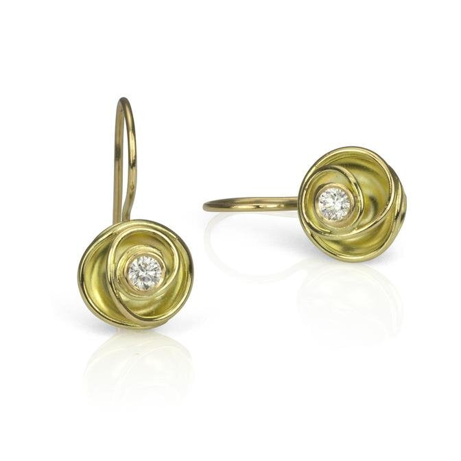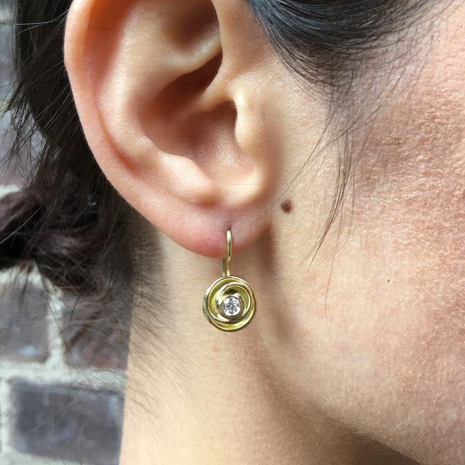 These 18k yellow gold earrings accentuate a center diamond that'll catch any eye while the French hook lets them gently drop from your ear. Perfect for a personal touch of elegance, these timeless earrings blend with any occasion while offering an elevated perspective on your day to day earring choice.