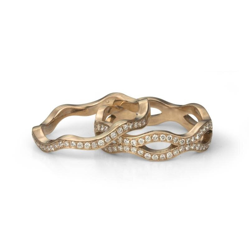 This 14k rose gold ring with pavé set diamonds reflects the freedom of a rolling wave through a calming ocean. Formed to stack as a pair or however many your finger can fit, this 14k rose gold ring is available in single or double width, and both boast pavé set diamonds of the finest quality.