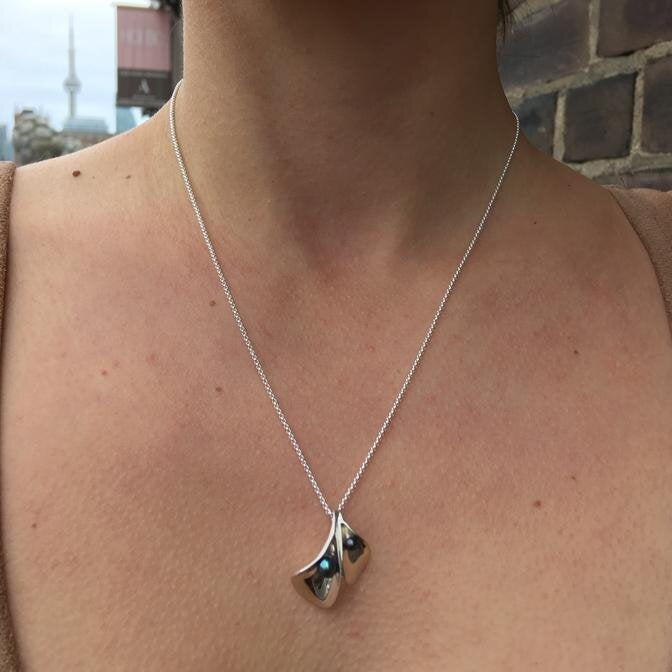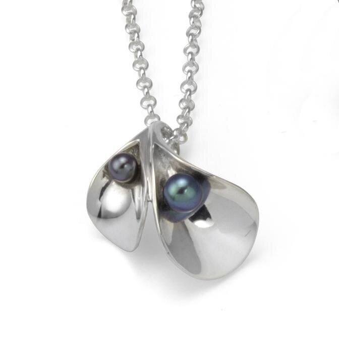 Made in sterling silver with two peacock pearls.Dimensions: The pendant is 2.5 cm long x 2 cm wide and comes on a 45.7 cm chain.