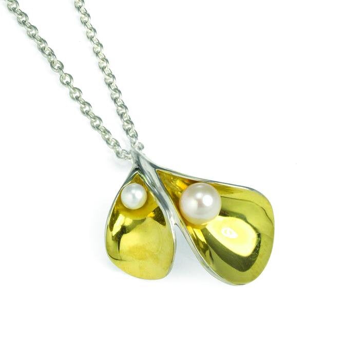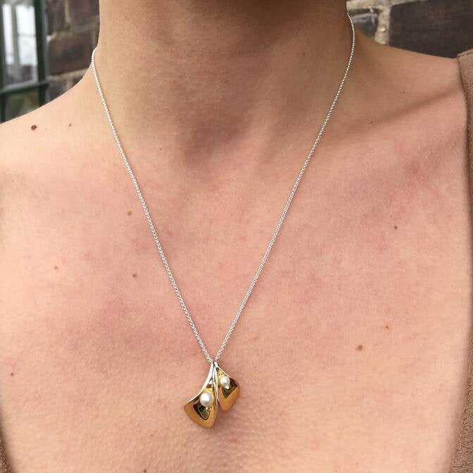 A sterling silver necklace that floats along the neckline from a silver chain with a pendant of gold-plated contrasting petals cradling two fresh water pearls. This is a perfect piece for any affair!