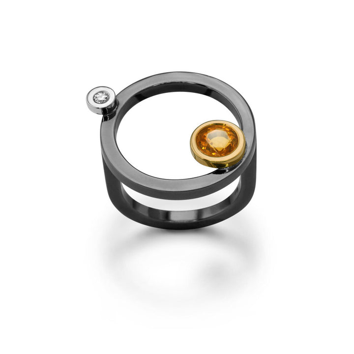 14k gold with black rhodium with a yellow sapphire, 0.87ct and a diamond, 0.03ct, VS clarity and G colour.