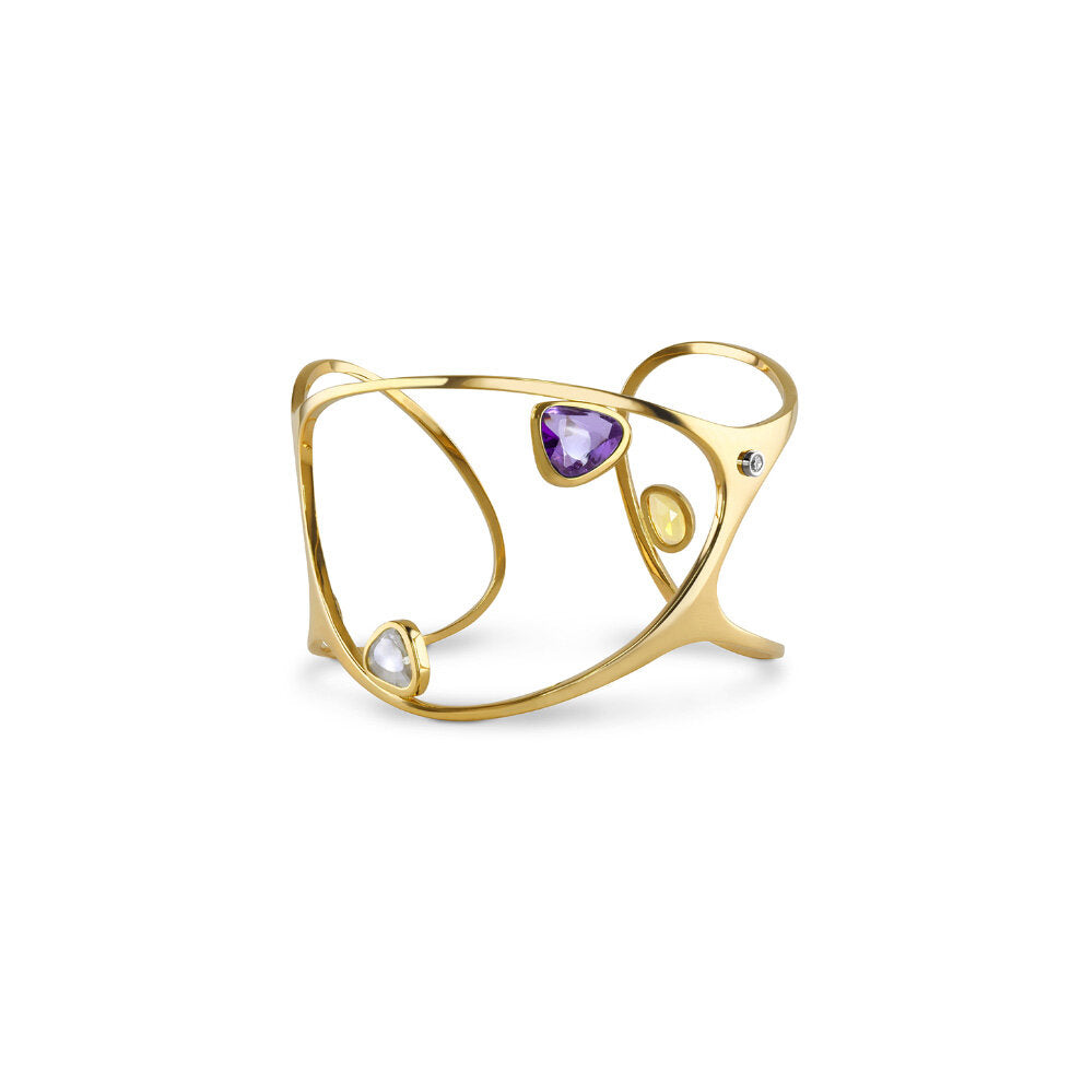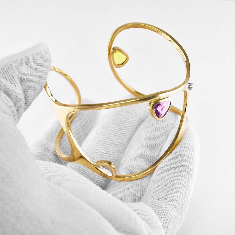 Inspired by a free, flawless style and gentle, curved shapes of Art Nouveau works, Daniela Komatović launched her exquisite jewelry collection - Liberty. The collection is strongly influenced by the Czech artist Alfons Mucha, the creator of distinctive design later developed to become Art Nouveau. The style is characterised by long, sinuous forms, tender colors and decorative, elegant elements. As delicate as it is daring, each piece carries the story of liberation. Make a statement with this unique gold bracelet featuring a diamond and pink, white and yellow sapphires.