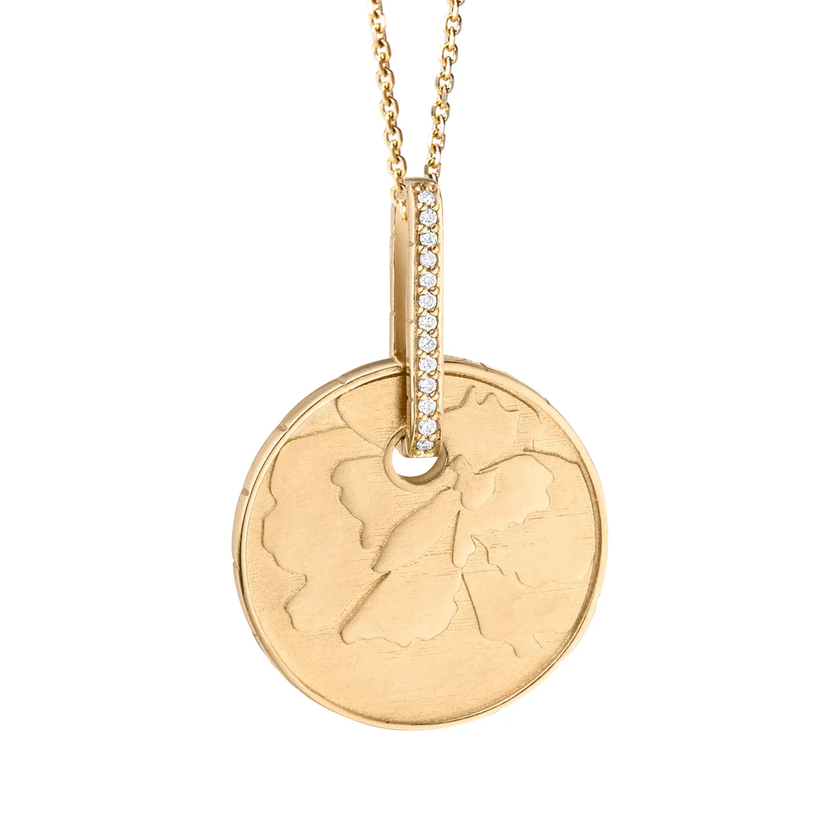 Recycled 18k gold with 26 lab-grown diamonds, 0.104cts total, excellent cut, G color and VS1 clarity.Dimensions: Chain length 42 cm / width 1.3 mm. Pendant length 28.5 mm (incl. eyelet) / width 20 mm / height pendant 1.7 mm / height eyelet 5.5 mm.
