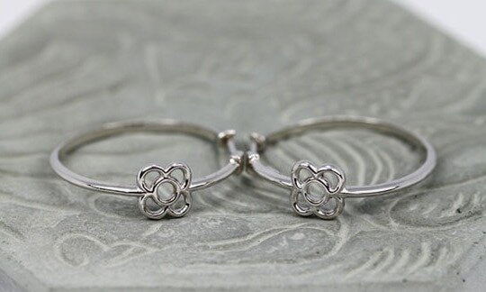 Made of white gold plated sterling silver.Dimensions: The size of the flower is 0.85 cm and the diameter of the hoop is 2.5 cm.