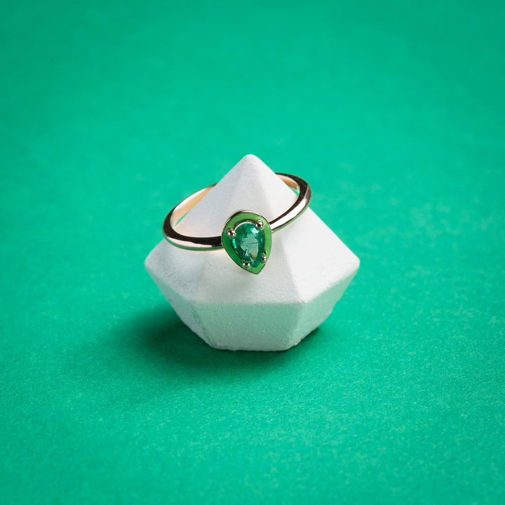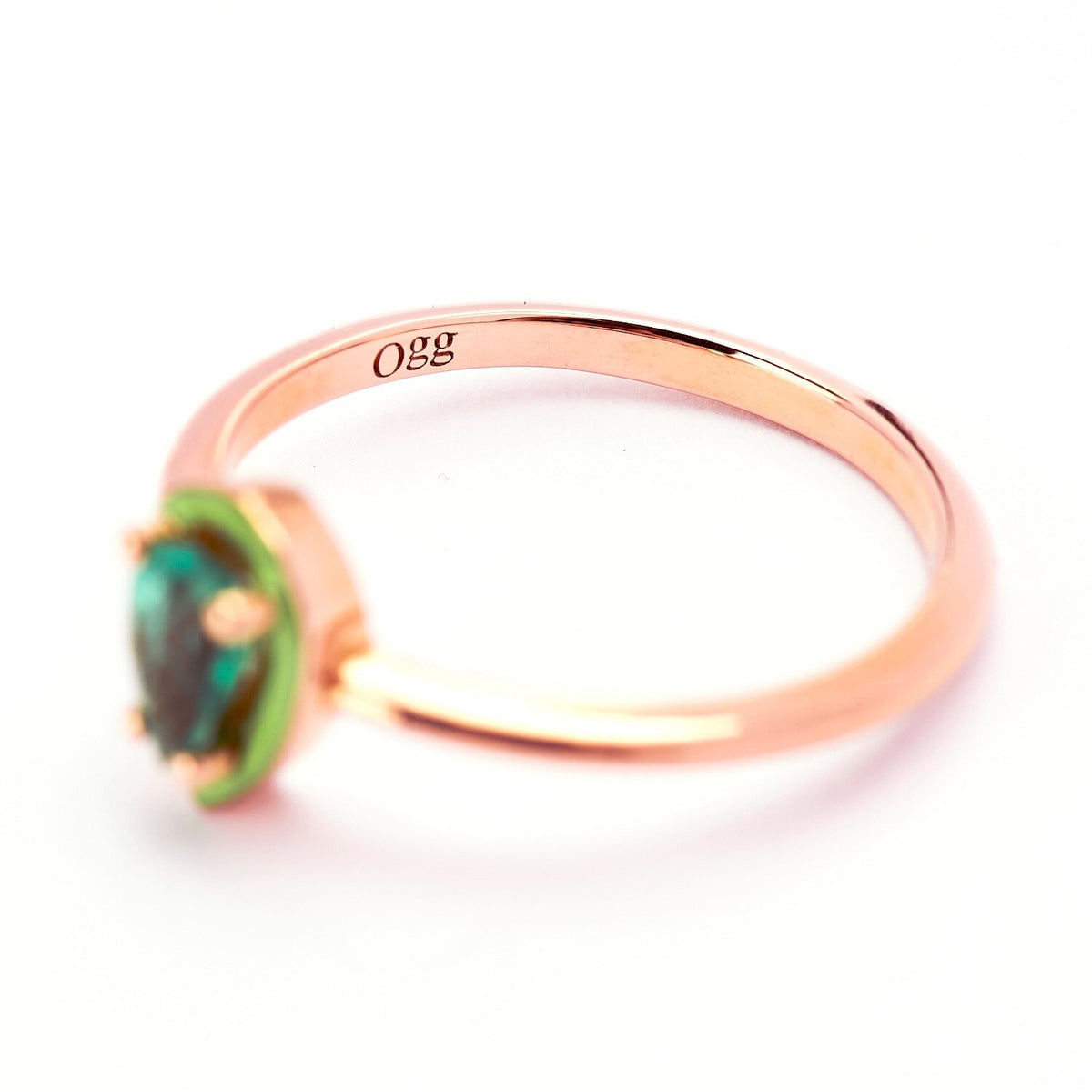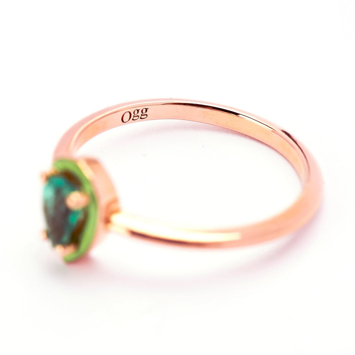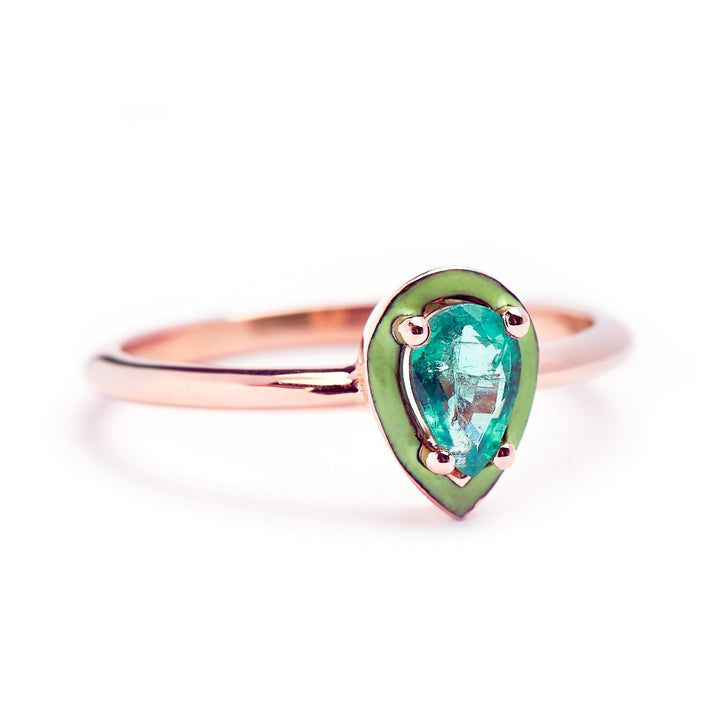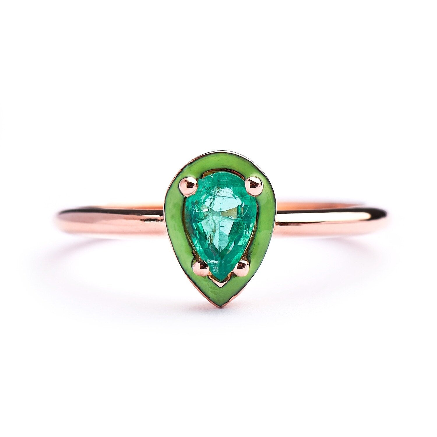 Made in 18k rose gold with a pear shape emerald and neon green hand-painted enamel.