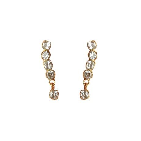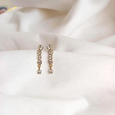 The Ourania long drop earrings comprise of a glorious mixture of cushion and brilliant cut earrings that are connected for a beautifully draped effect. They are made from gleaming 14 karat gold and are just as suited for formal events or date nights.Ourania was one of the nine Muses associated with astronomy and astrology in Greek mythology. She was also a patron of music, song, and dance. With these beautiful earrings, you could dance her way among the moon and stars.