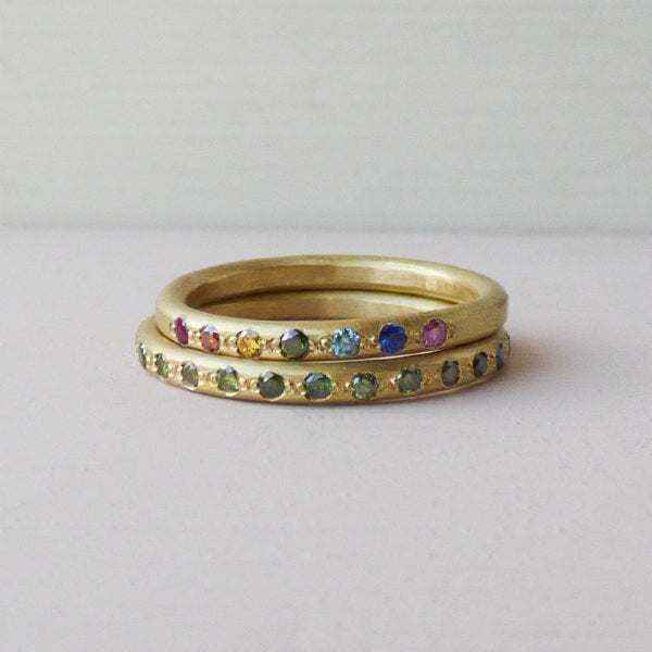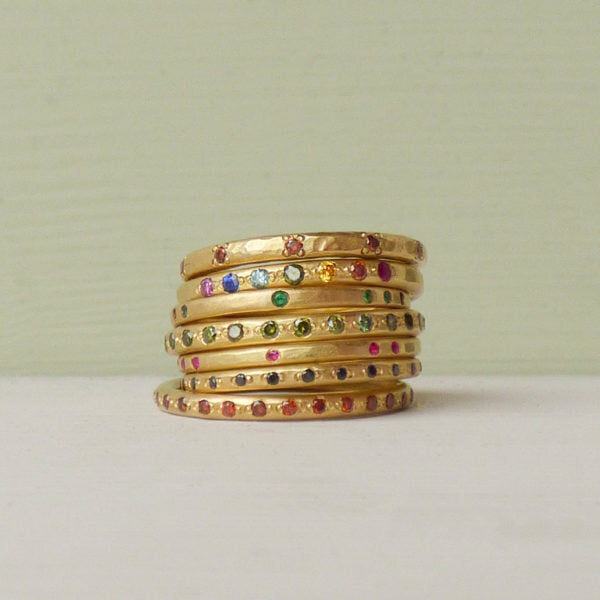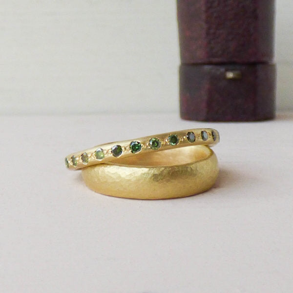 Made in 18k Fairtrade yellow, white or rose gold with 30 green diamonds (this may vary according to finger size). Alternative gemstones available include blue sapphires, champagne diamonds, cognac diamonds, diamonds, grey diamonds, pink sapphires, rubies or yellow diamonds.Dimensions: 2mm wide x 1.8mm thick hammered band. The diamonds are 1.4 mm.