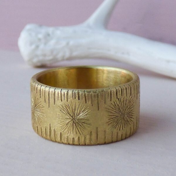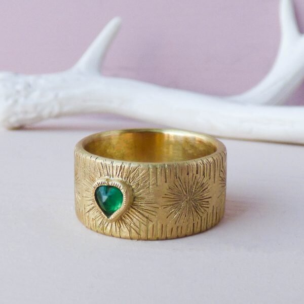 This Esma ethical ring is a modern heirloom with plenty of charm. It would work perfectly as an alternative wedding ring or a statement piece worn on the middle finger. The inverted emerald heart has tiny lines stamped around the edge of the stone. The thick gold band has hand-stamped patterns added to it, reminiscent of Native American Indian style jewellery.