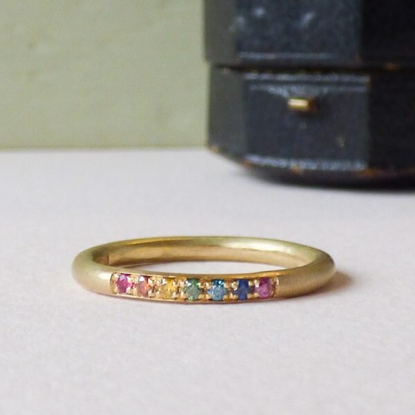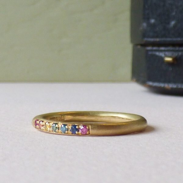 Made in 18k Fairtrade yellow, white or rose gold with five coloured diamonds, a ruby and a blue sapphire.Dimensions: The band is 2 mm round. The gemstones are 1.5 mm.