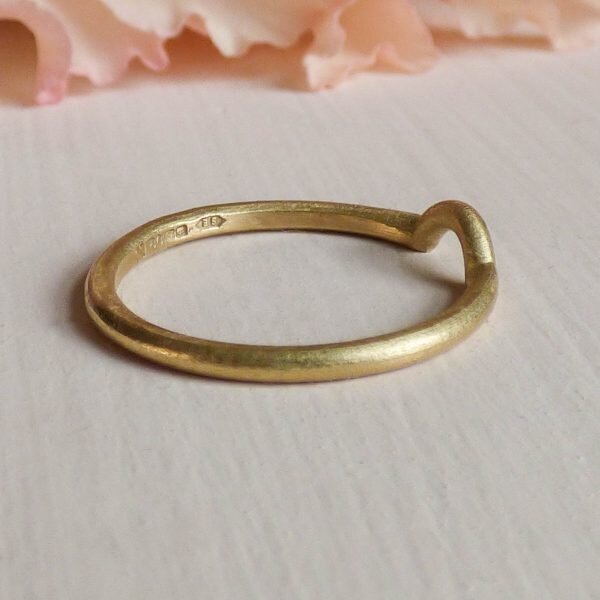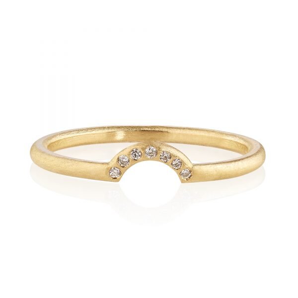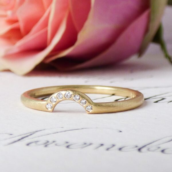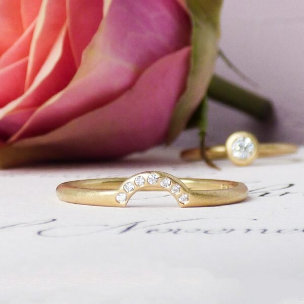 This adorable ethical wedding ring has an arc at its centre that has been set with seven sparkly white diamonds. This ring is so pretty on its own, but even better wrapped around a classic solitaire engagement ring.
