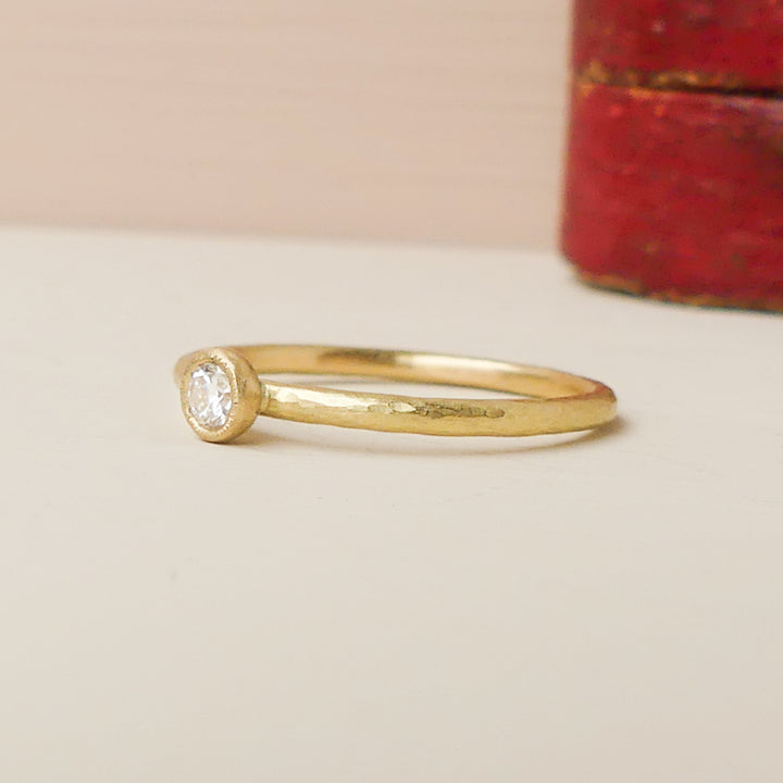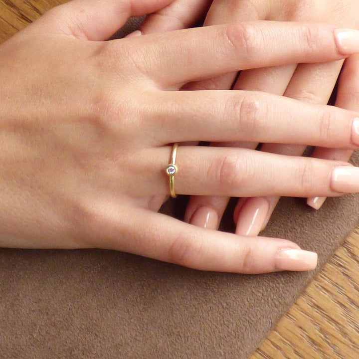 Made in 18k Fairtrade yellow, white or rose gold with a CanadaMark round brilliant cut diamond.Dimensions: The band is 1.5 mm round wire. The diamond is 2.5 mm.
