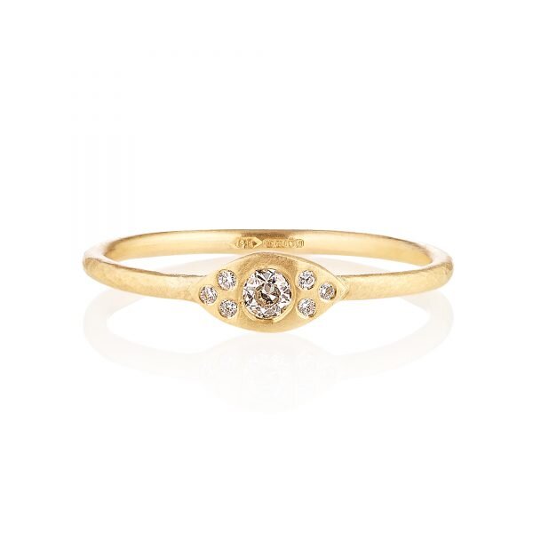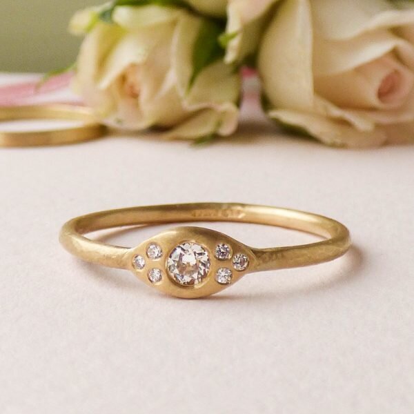 The Mia ethical engagement ring has oodles of artisanal charm. It has a modern aesthetic and evokes pure old-fashioned romance. It features a central diamond surrounded by six smaller diamonds set into an almond shape within the band.