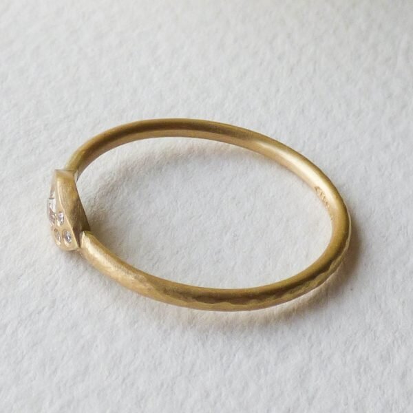 Made in 18k Fairtrade yellow, white or rose gold with a 0.10 ct CanadaMark diamond and six smaller CanadaMark diamonds.Dimensions: The hammered band is 1.5 mm. The central diamond is 3 mm. The smaller diamonds are 1.2 mm.