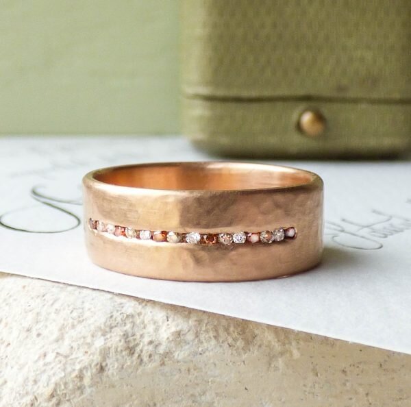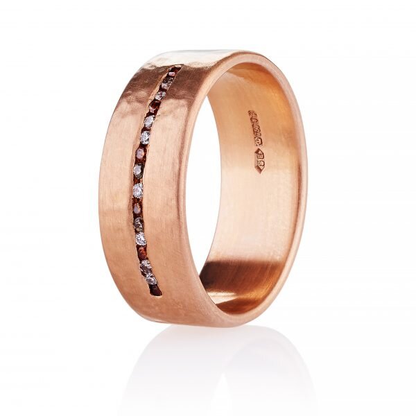 The Celine ethical wedding ring has huge “wow' factor and is perfect if you want to wear your wedding ring solo, but with a bit of engagement bling. The band is flat with soft, curved edges and features 16 diamonds in warm colours.