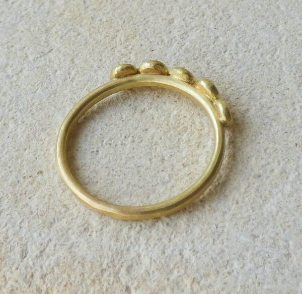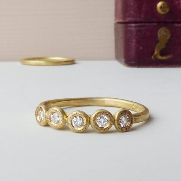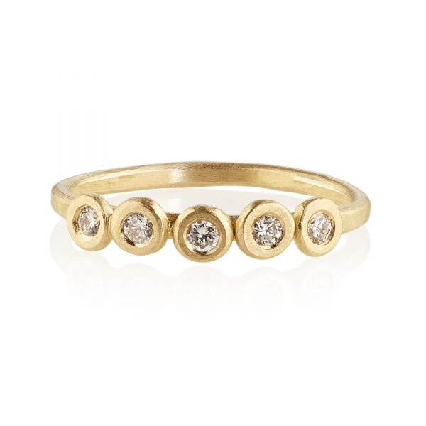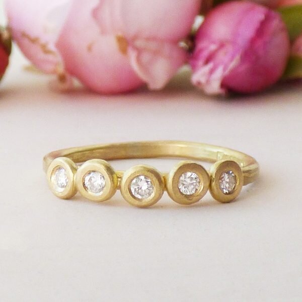 The gorgeous Dixie ethical engagement ring has a sweet, romantic charm. Perfect for the artisanal girl who treasures handmade things. Five nuggets of gold were hammered flat before being added to the band and then set with five brilliant cut diamonds.