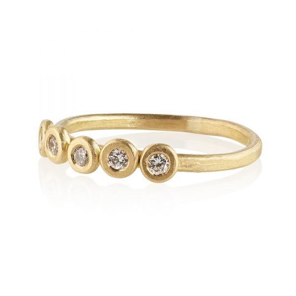 Made in 18k Fairtrade yellow, white or rose gold with five brilliant cut CanadaMark diamonds. Alternative gemstones available are: black diamonds, blue sapphires, champagne diamonds, cognac diamonds, emeralds, pink sapphires, rubies and yellow sapphires.Dimensions: 1.5 mm hammered band. The diamonds are 2 mm.