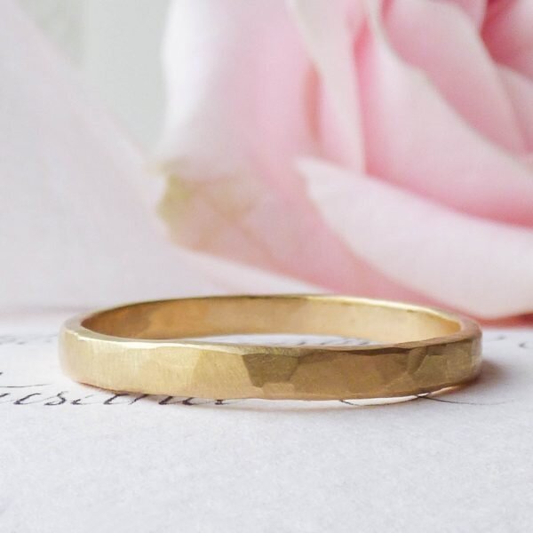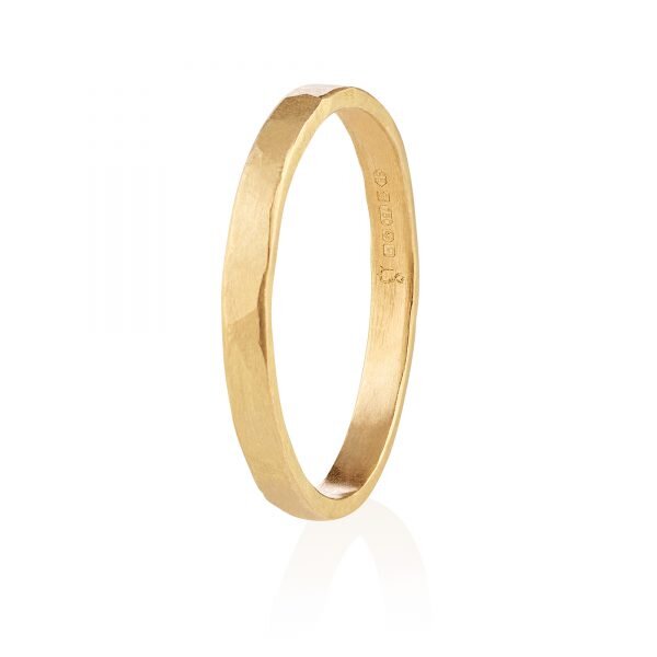 This ethical wedding ring has soul! It has been hammered flat which gives a slightly rustic feel to this luxurious gold wedding band.