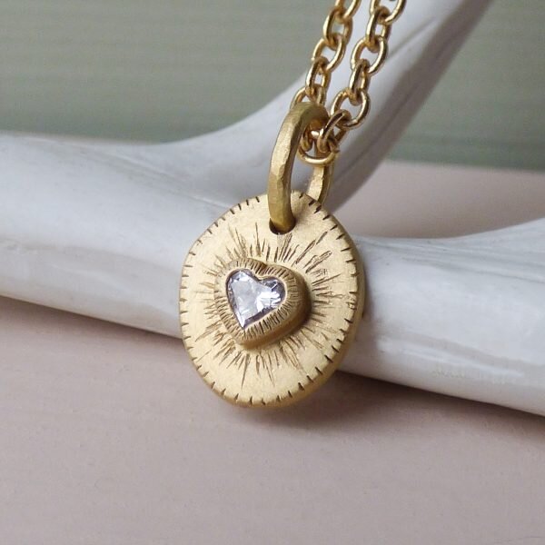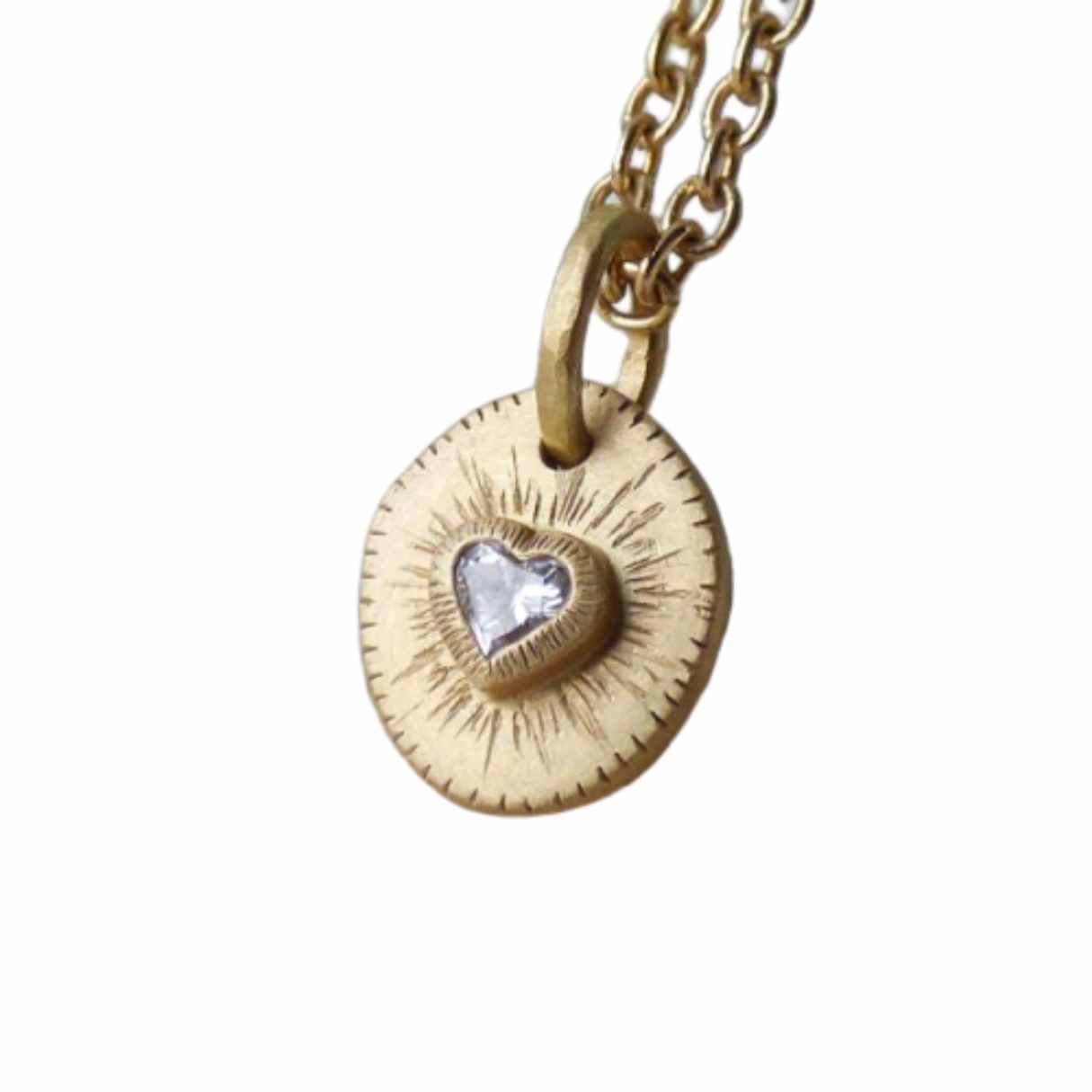 Made in 18k Fairtrade yellow, white or rose gold with a gemstone choice of diamond, emerald or ruby. You may choose between a tiny trace chain, a medium trace chain (see pictured) or a Queenie chain or purchase the pendant only.Dimensions: The oval pendant is 10 mm x 11 mm with a 1.3 mm base. The heart shape is 4 mm x 3 mm. The gold chains come in a variety of lengths: 41 cm, 46 cm or 51 cm. For the tiny trace chain: the wire thickness is 0.37 mm, the links are 1.49 mm x 1.80 mm. For the medium trace chain: the wire thickness is 0.47 mm, the links are 2.03 x 2.55 mm. For the Queenie chain, the wire thickness is 0.6 mm and the diameter is 3.7 mm.