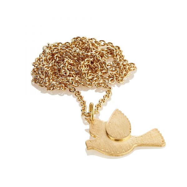 Made in 18k Fairtrade yellow gold. You may choose the gold chain type: a tiny trace chain, a medium trace chain or a Queenie chain or purchase the pendant only.Dimensions: The dove pendant is 13 mm x 15 mm x 0.8 mm. The chains come in a variety of lengths: 41 cm, 46 cm and 51 cm. For the tiny trace chain: the wire thickness is 0.37 mm, the links are 1.49 mm x 1.80 mm. For the medium trace chain: the wire thickness is 0.47 mm, the links are 2.03 x 2.55 mm. For the Queenie chain, the wire thickness is 0.6 mm and the diameter is 3.7 mm.