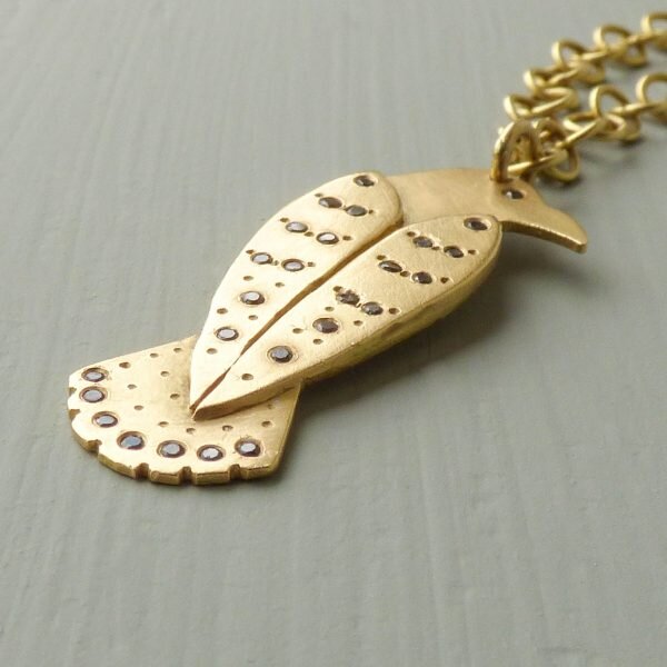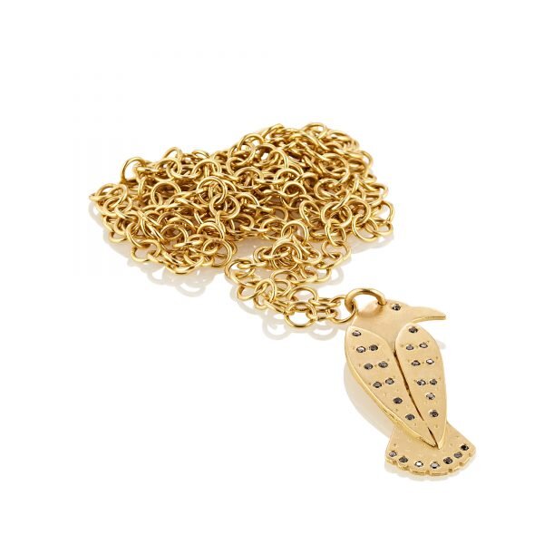Made in 18k Fairtrade gold with 26 black diamonds. You may choose the gold chain type: a medium trace chain or a Queenie chain (see pictured) or purchase the pendant only.Dimensions: The pendant is 1.75 mm thick and measures 30 mm high x 12 mm wide (at the widest part). The black diamonds are 1 mm diameter. The chains come in a variety of lengths: 41 cm, 46 cm and 51 cm. For the medium trace chain: the wire thickness is 0.47 mm, the links are 2.03 x 2.55 mm. For the Queenie chain, the wire thickness is 0.6 mm and the diameter of the links is 3.7 mm.