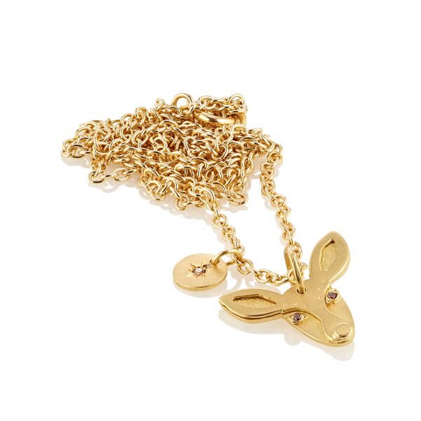 Made in 18k Fairtrade gold with cognac or chocolate coloured diamonds. You may choose a medium trace chain with or without a gold disc or purchase the pendant only.Dimensions: The deer pendant is 16 mm high, 18.00 mm wide (from ear to ear) and 1 mm thick. The gold disc has a 7 mm diameter with 1.5 mm cognac or chocolate diamond. The chain comes in two lengths: 46 cm and 51 cm. For the medium trace chain: the wire thickness is 0.47 mm, the links are 2.03 x 2.55 mm.