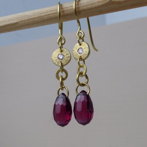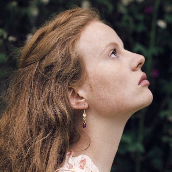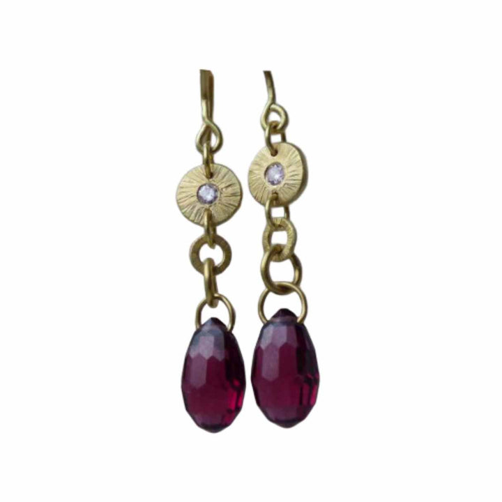 Made in 18k Fairtrade yellow gold with hand-cut garnet gemstone drops and two pale pink coloured diamonds.Dimensions: The gold discs are 7 mm with 1.2 mm thickness. The pink diamonds are 2 mm. The garnet gemstone drops are 11 mm x 7 mm with 5.2 mm thickness.