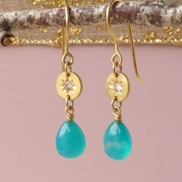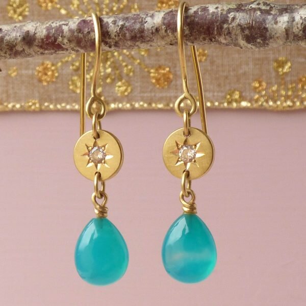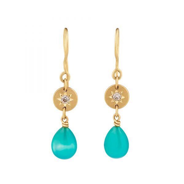 These ethical earrings, made with hand cut chrysocolla gemstones and two sparkly champagne coloured diamonds are like drops from the ocean. Shakti Ellenwood has nicknamed them her 'good vibe earrings' as they always take her back to long summer days on the island of Ibiza. The ancient Egyptians called chrysocolla the 'wise stone' because, they believed, it instilled the wearer with love, intuition and above all patience. The star setting, surrounding the diamond, encourages us to follow our own star and let it guide us.