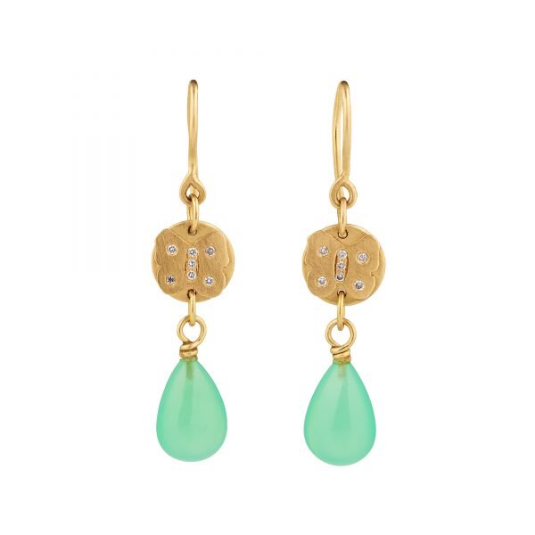 Made in 18k Fairtrade yellow gold with diamonds and chrysoprase drops.Dimensions: The gold discs are 8 mm. The diamonds are 1 mm. The chrysoprase drops are 10 mm x 7 mm x 5 mm.