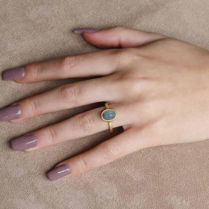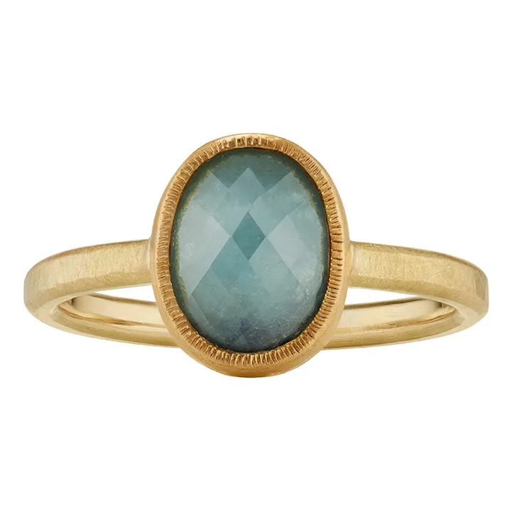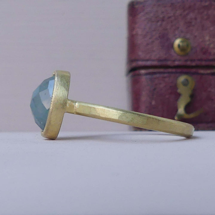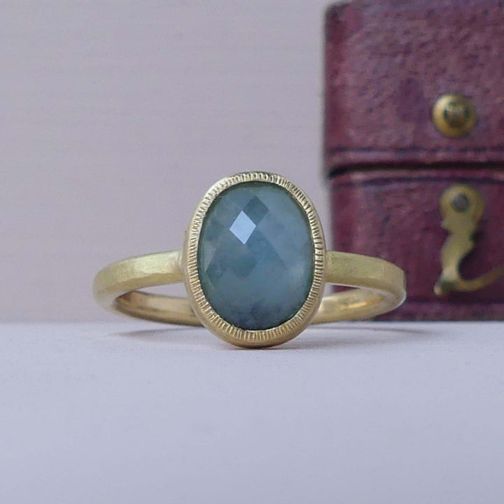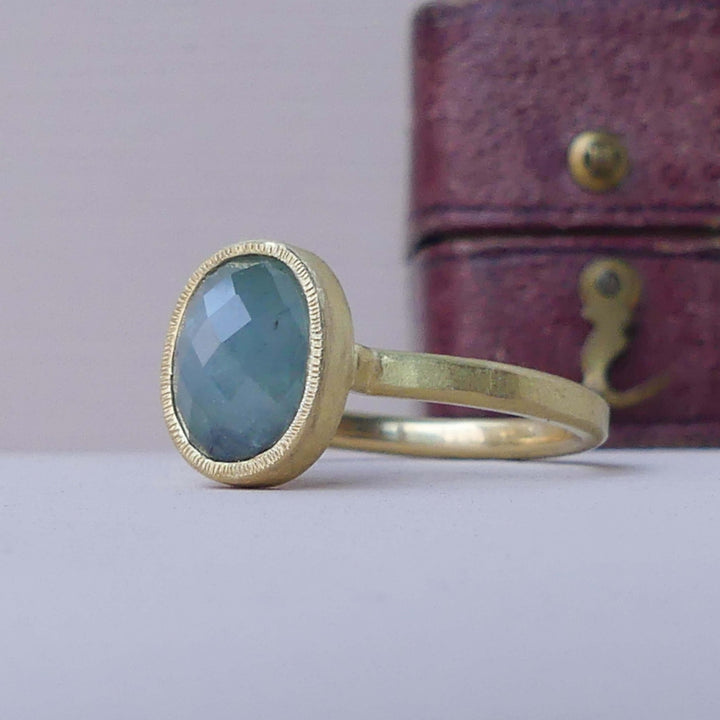 The Ocean ethical engagement ring has a deep and mysterious quality, like the water she is named after. She's one-of-a-kind and perfect if you are looking for a unique alternative to the high street. Tiny stamped lines surround the inky blue Malawi sapphire set in a gently hammered gold band.