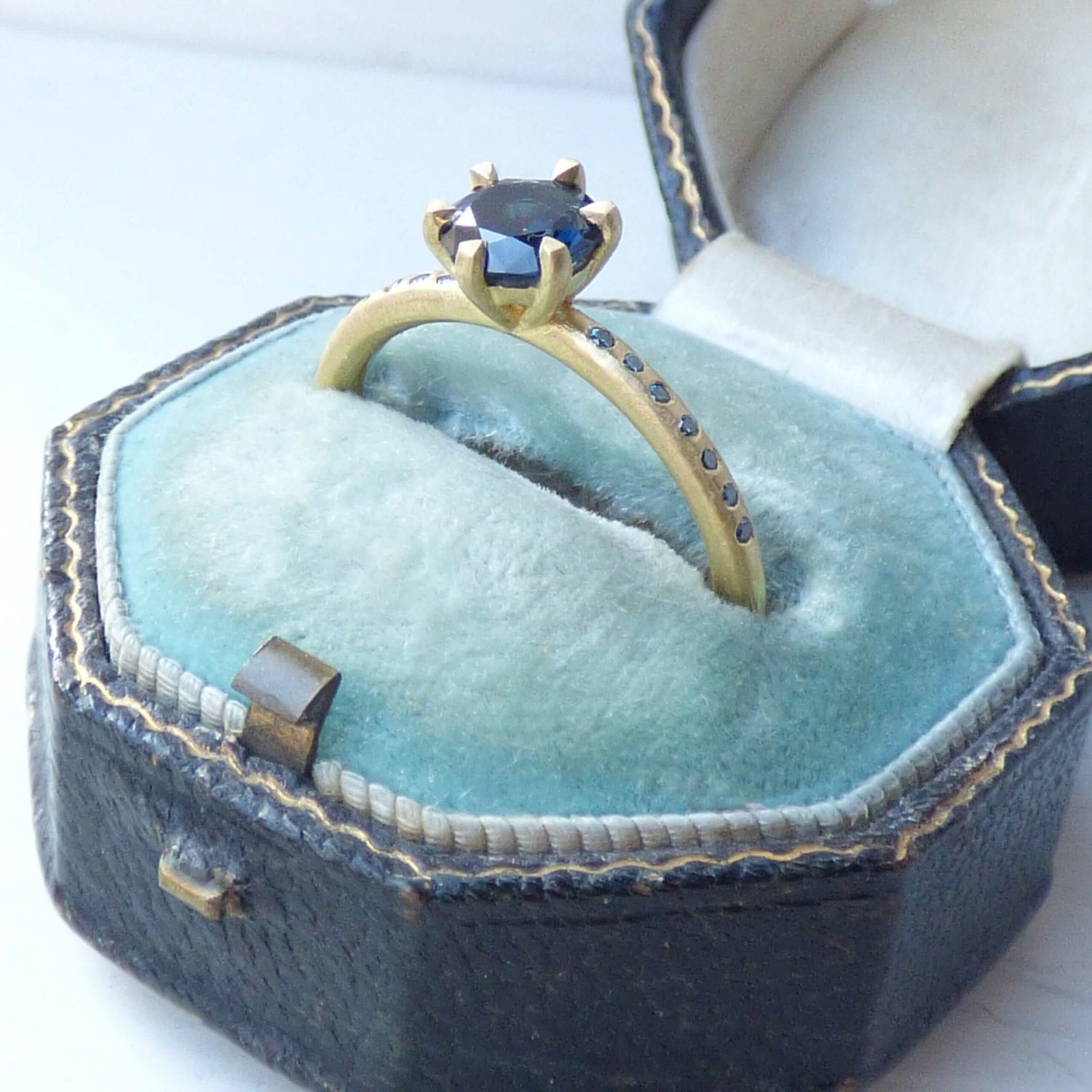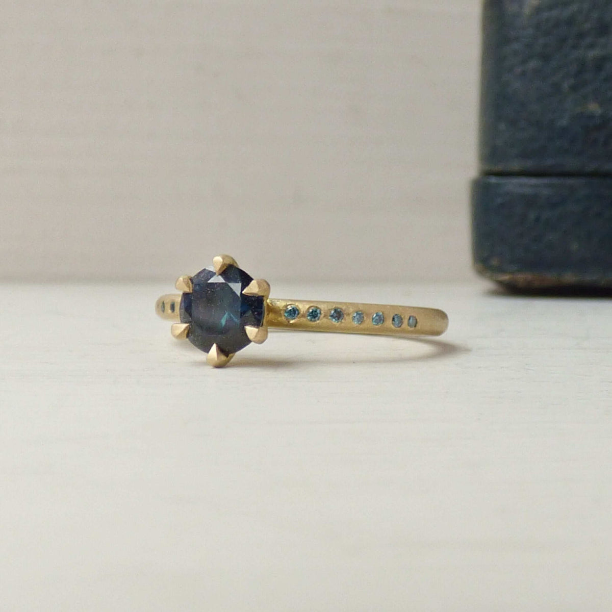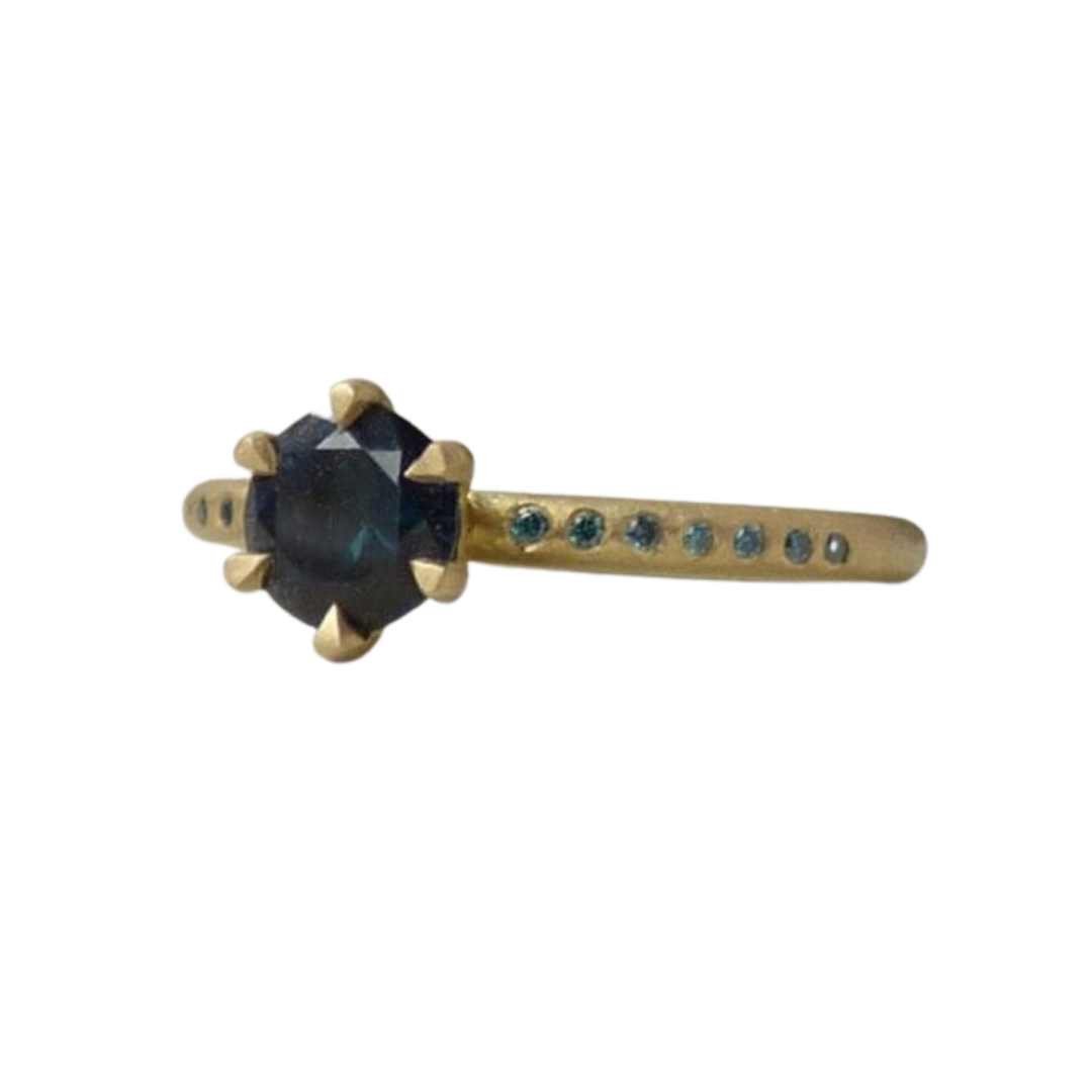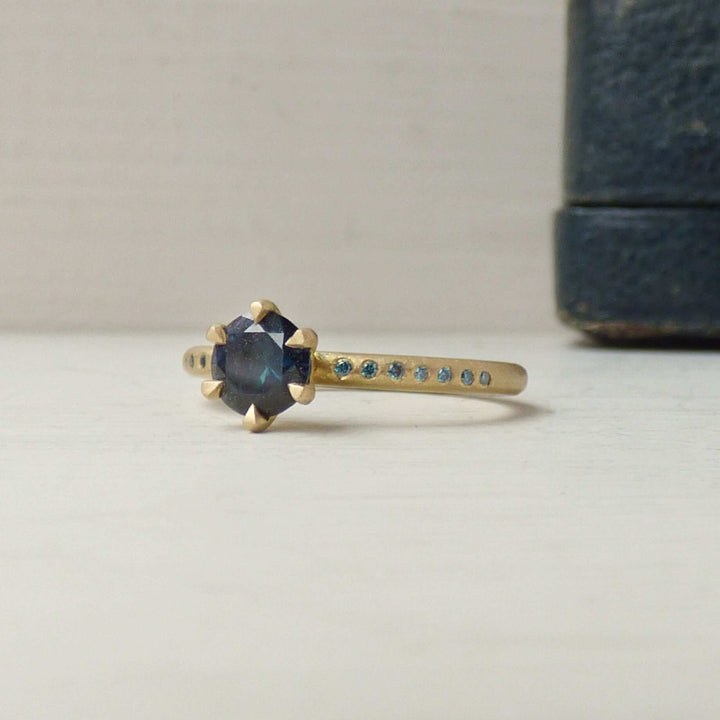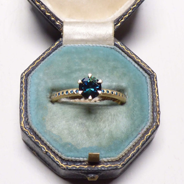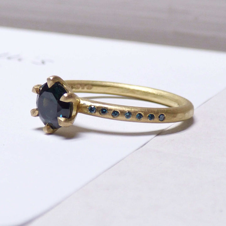 18k Fairtrade gold with 0.75cts Australian parti sapphire and 14 turquoise diamonds.Dimensions: Band: round with slight hammer 1.95 mm diameter x 1.75 mm depth gold. Diamonds: 1 mm.