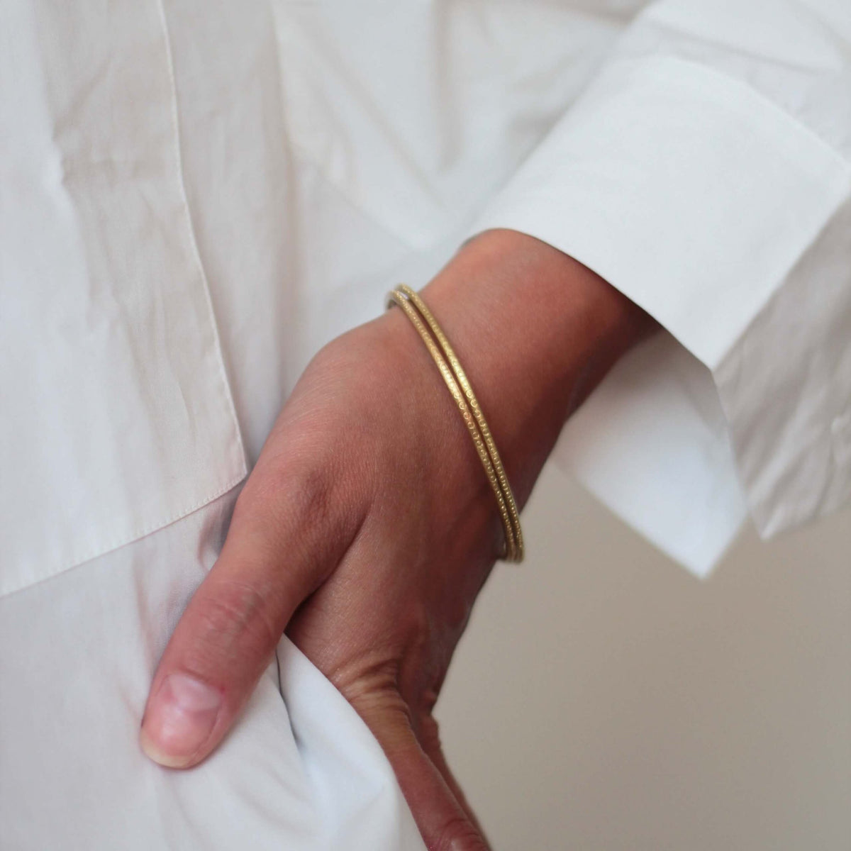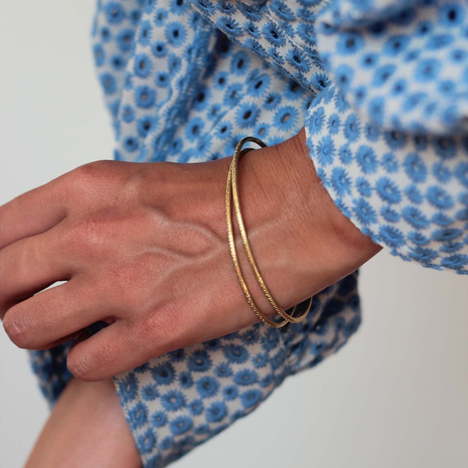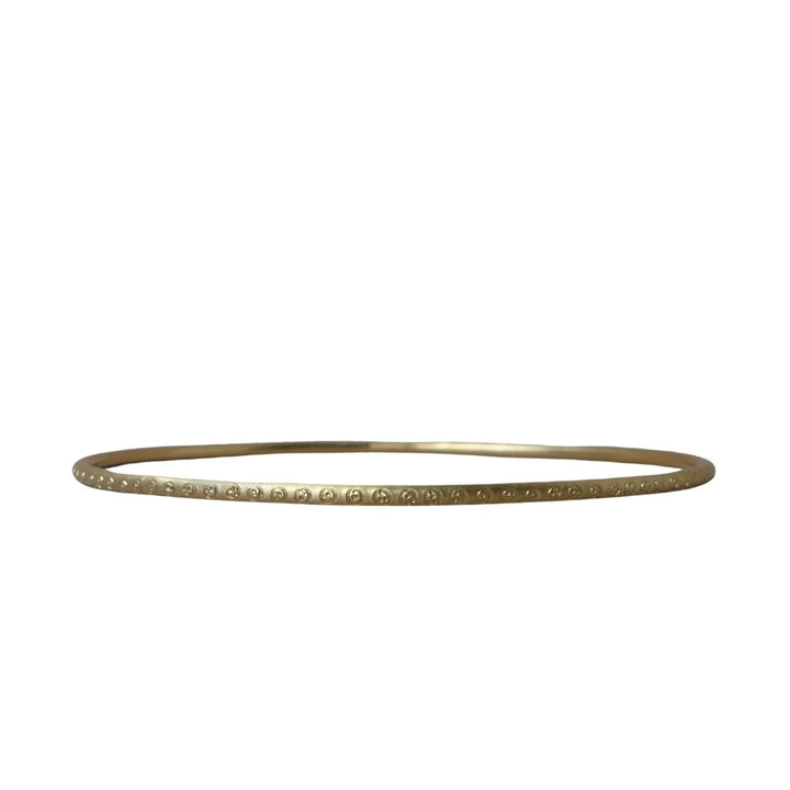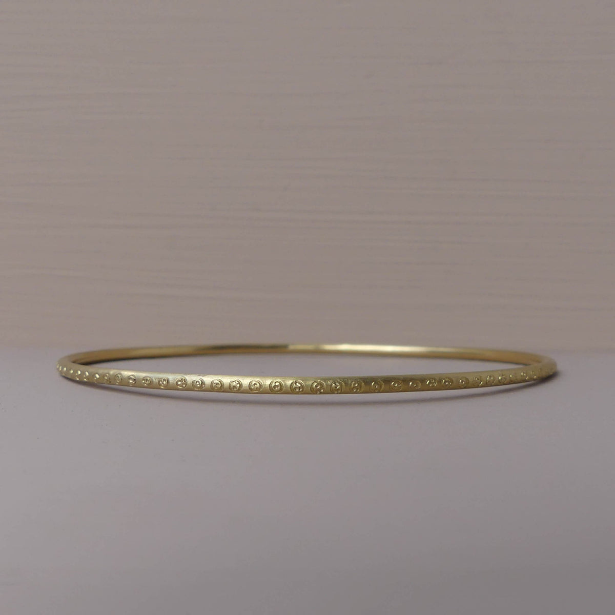 Handcrafted with solid gold wire with the most glorious pattern reminiscent of Indian block prints. The bangle is oval in shape which makes a better fit for the wrist than round.