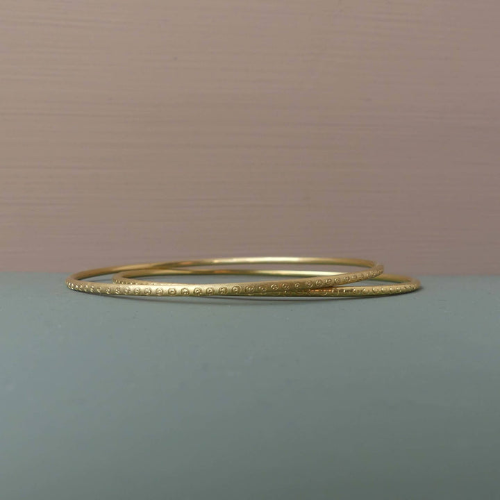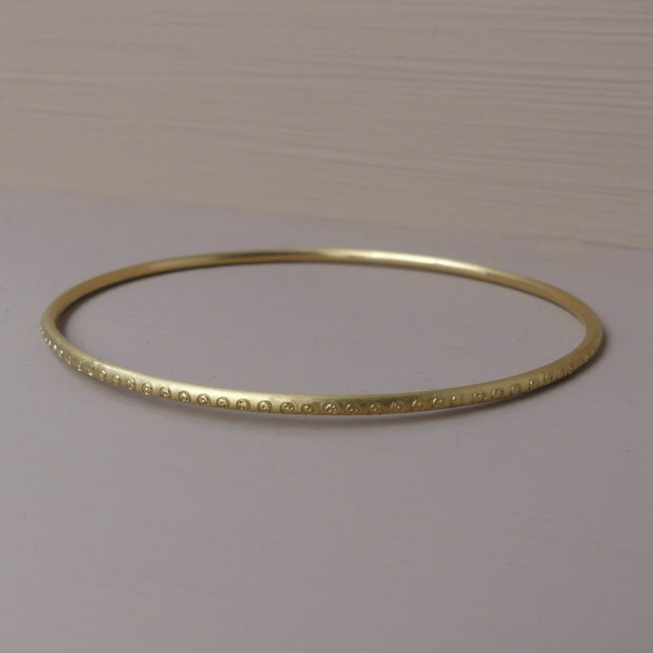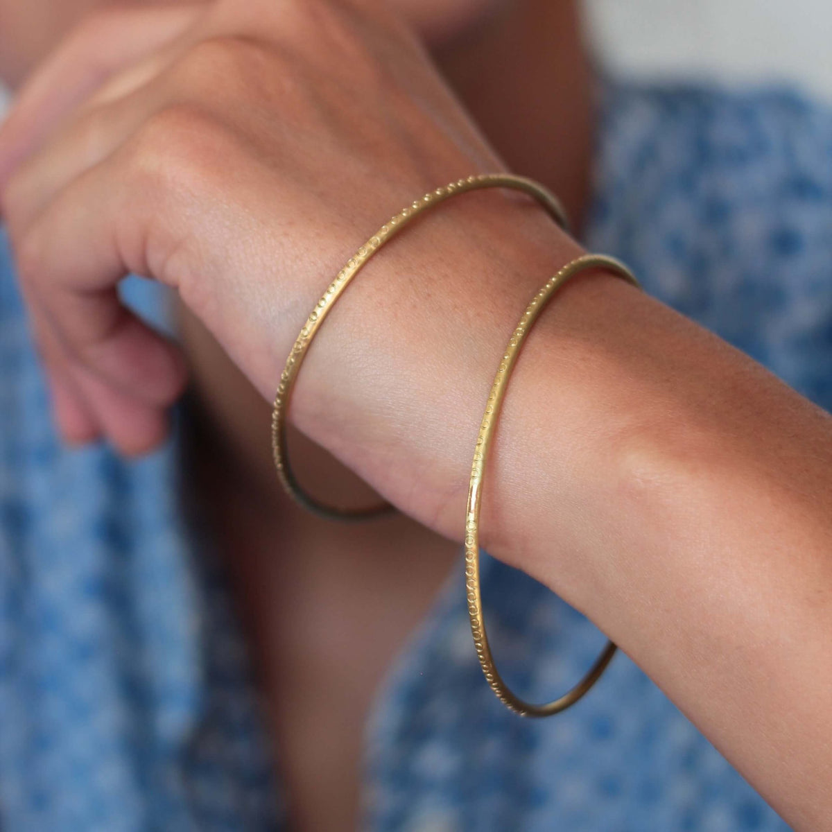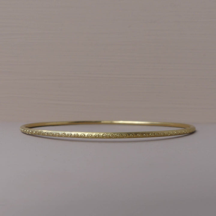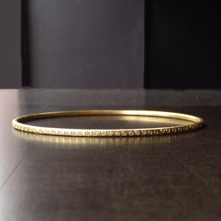 Handcrafted with solid gold wire with the most glorious pattern reminiscent of Indian block prints. The bangle is oval in shape which makes a better fit for the wrist than round.