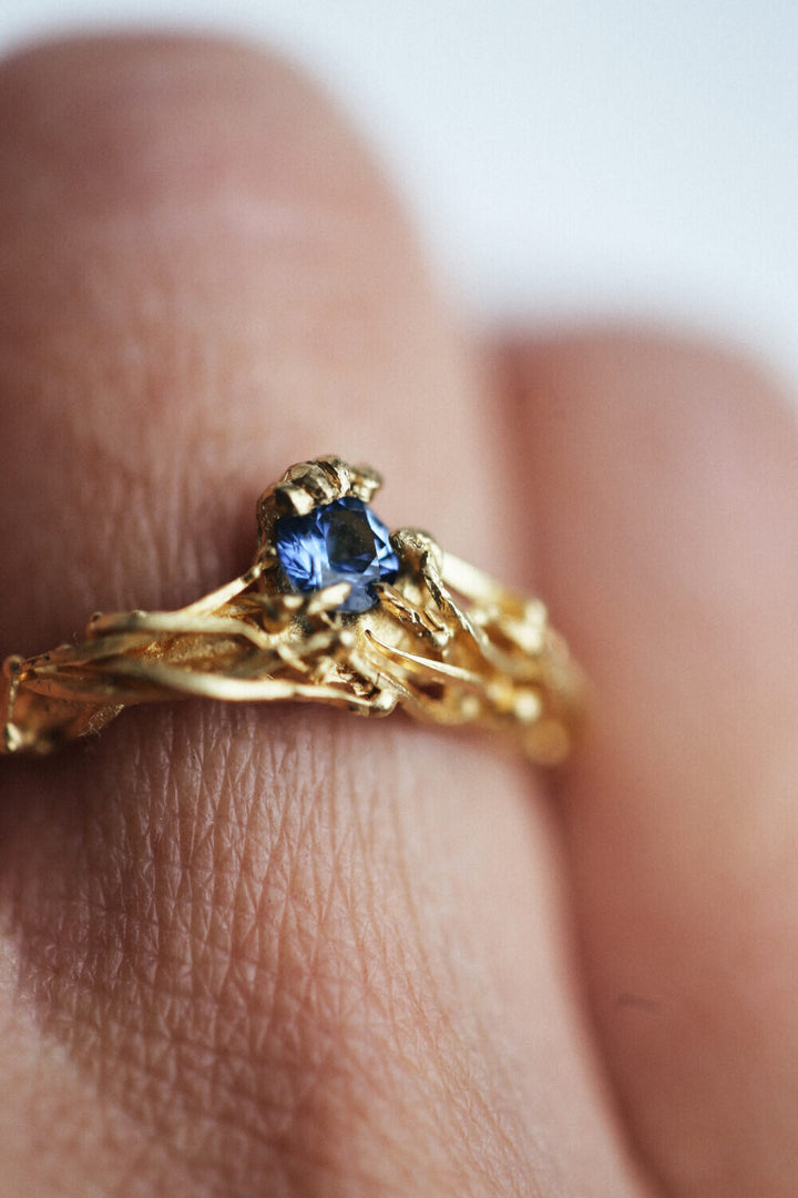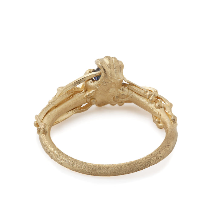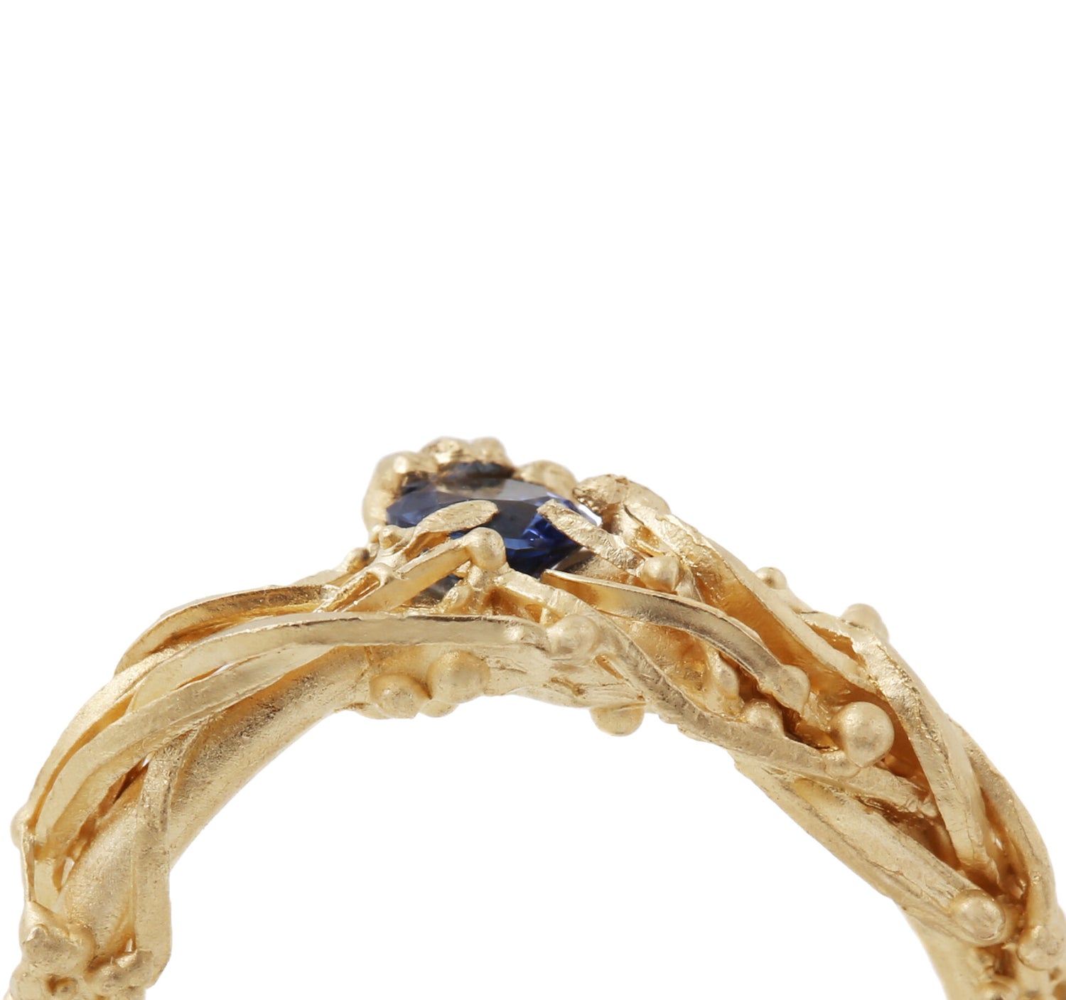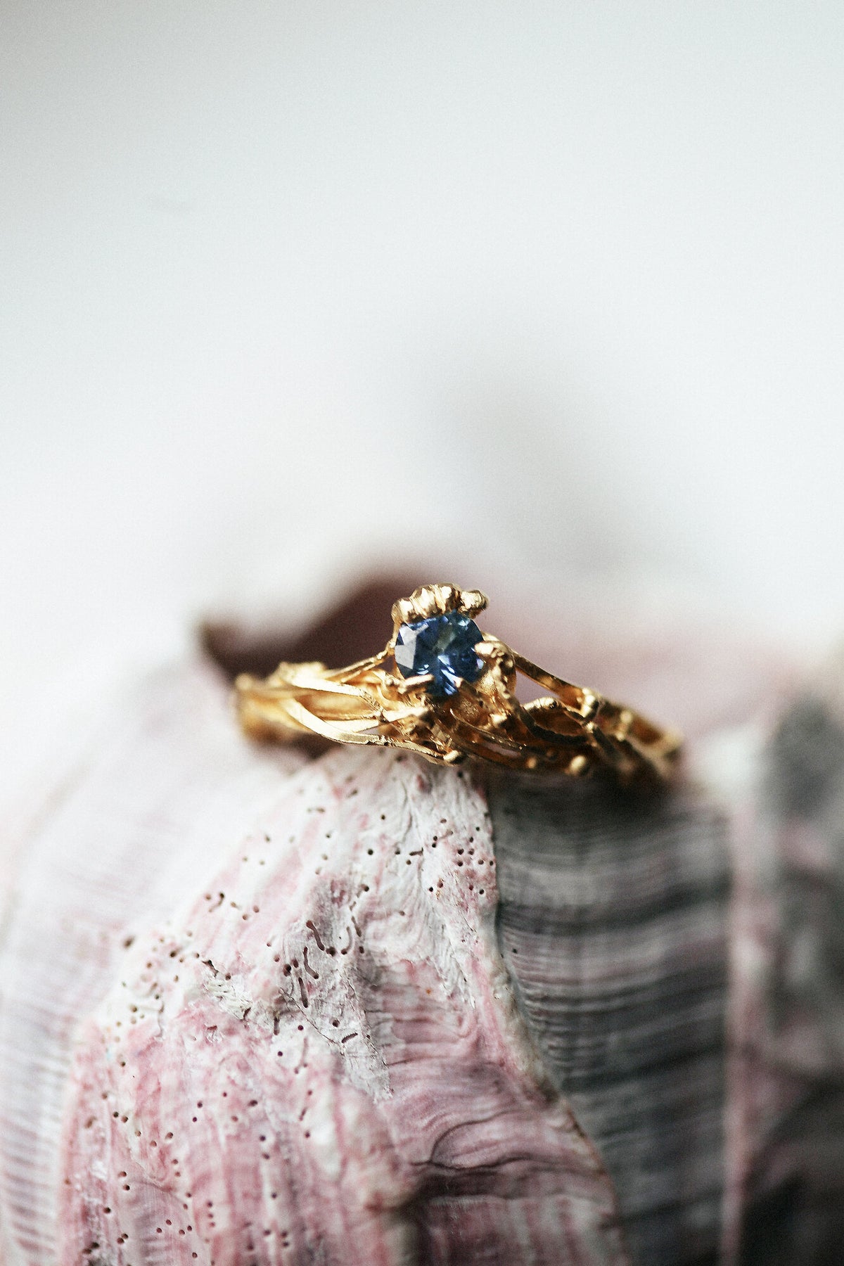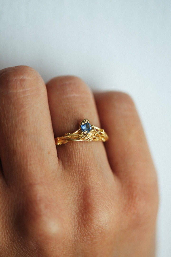 Dovile's magical Sirens collection is inspired by the Greek epic poem of Homer - The Odyssey. This beautiful ring is inspired by the famous scene of Odysseus being bound to the mast of his ship, in order to resist the seductive Sirens' song. Odysseus ordered his men to leave him tied tightly to the mast, no matter how much he might beg. Dovile found the story beautiful as it shows the strength of love. This ring is made with recycled 18k yellow gold and and a natural blue sapphire. The seaweeds are carefully arranged to create the look of them tangling together around the hand of Odysseus.