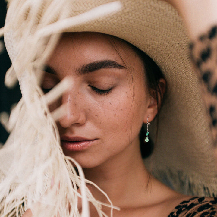 Catherine found these gorgeous little turquoise beads while on a trip to Turkey. Of course, she could not resist the wonderful and luscious shade of blue green they have and had to get a few of them. She married them with light green Colombian emerald tear drops, hanging from delicate gold chains she got from Paris. Wearing these earrings is like travelling around the world!