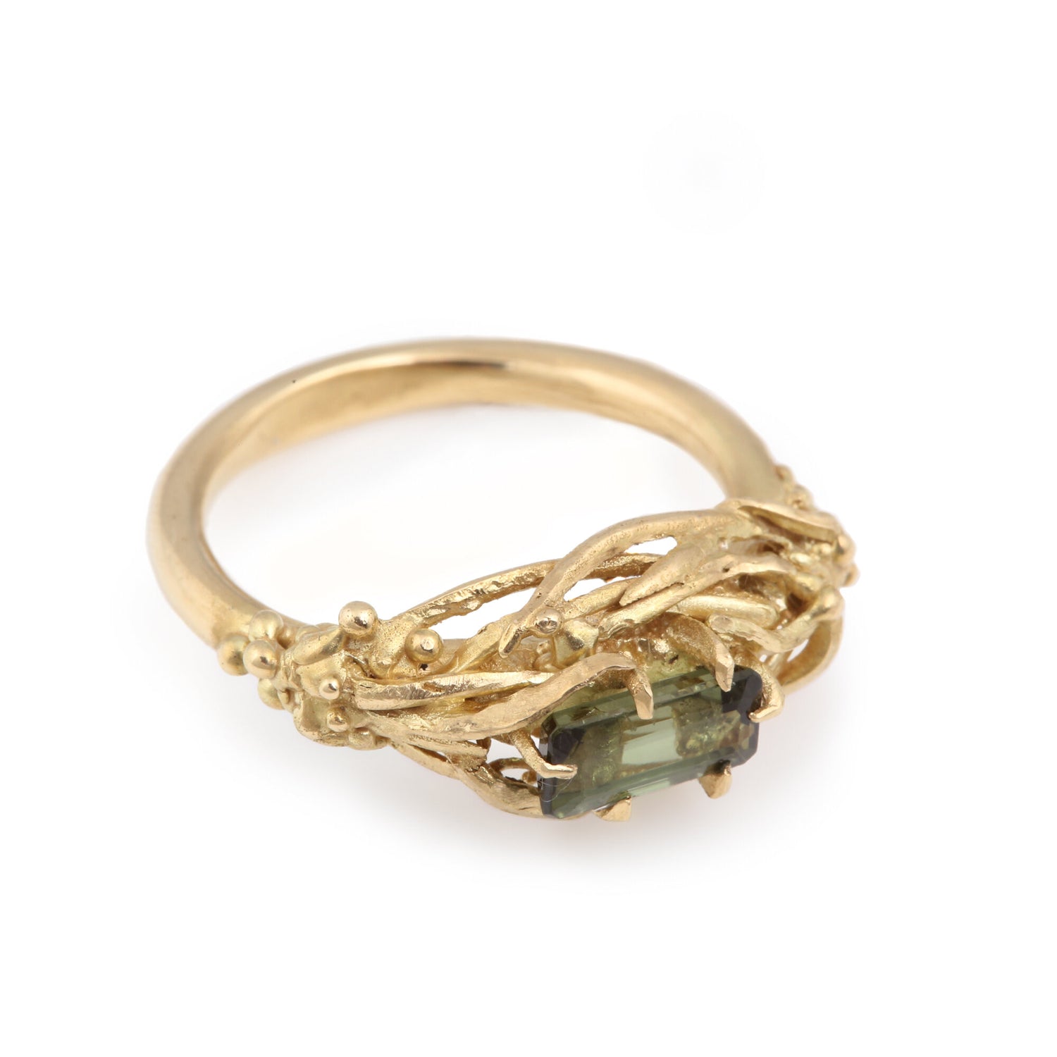 Dovile's magical Sirens collection brings to life the dreaminess of secret underwater gardens and minuscule worlds. This gorgeous 18k yellow gold ring features a light green emerald cut tourmaline from Nepal. The elegantly hand cut lines inspired by Himalayan Juniper twigs and needles tangle together and hug the green tourmaline. A truly timeless and unique one-of-a-kind ring that can be worn as a daily ring or alternative engagement ring.