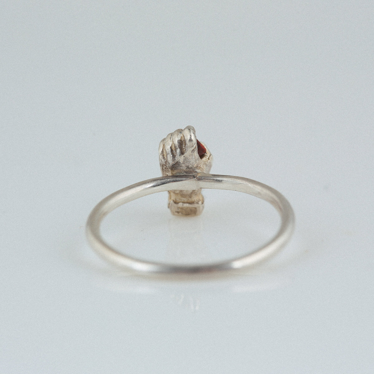 Dovile's Hand collection celebrates love in an unconventional way and creates strong emotions for the wearer. These magical and slightly dark jewels transport the wearer through the divine essence of passion and affection. This silver miniature hand ring holds a square cut red garnet in its palm. The gemstone symbolises the heart, making this a perfect gift for the loved one.