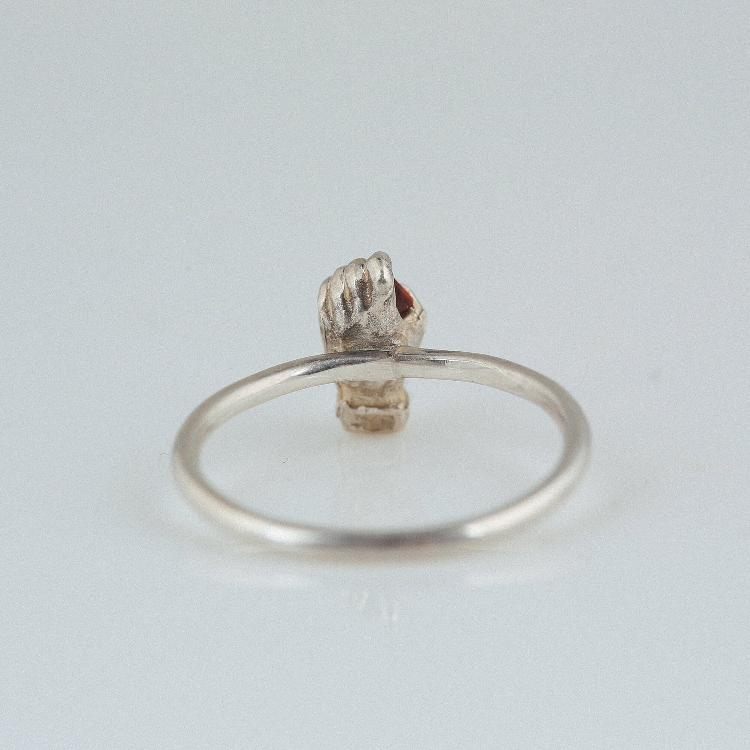 Recycled sterling silver with a red garnet.Dimensions: The hand is approx. 9mm x 5mm x 4mm. The band width is 1.5mm.