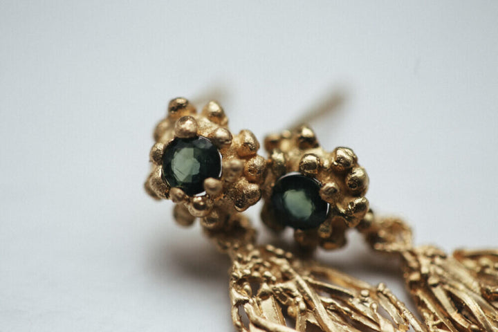 Dovile's Sirens collection is inspired by the Greek epic poem of Homer - The Odyssey. Particularly by the scene were Odysseus meets seductive Sirens, beautiful but dangerous creatures who lured sailors to shipwreck with their songs. The notion of love conquering fear is so strong in this poem and inspired Dovile to make this dreamy collection. These intricate statement earrings are made in 18k gold with round teal sapphires sunken into coral textured studs. The seaweeds are carefully cut and arranged by hand to create feather-like shapes representing the wings of the enchanting sirens.