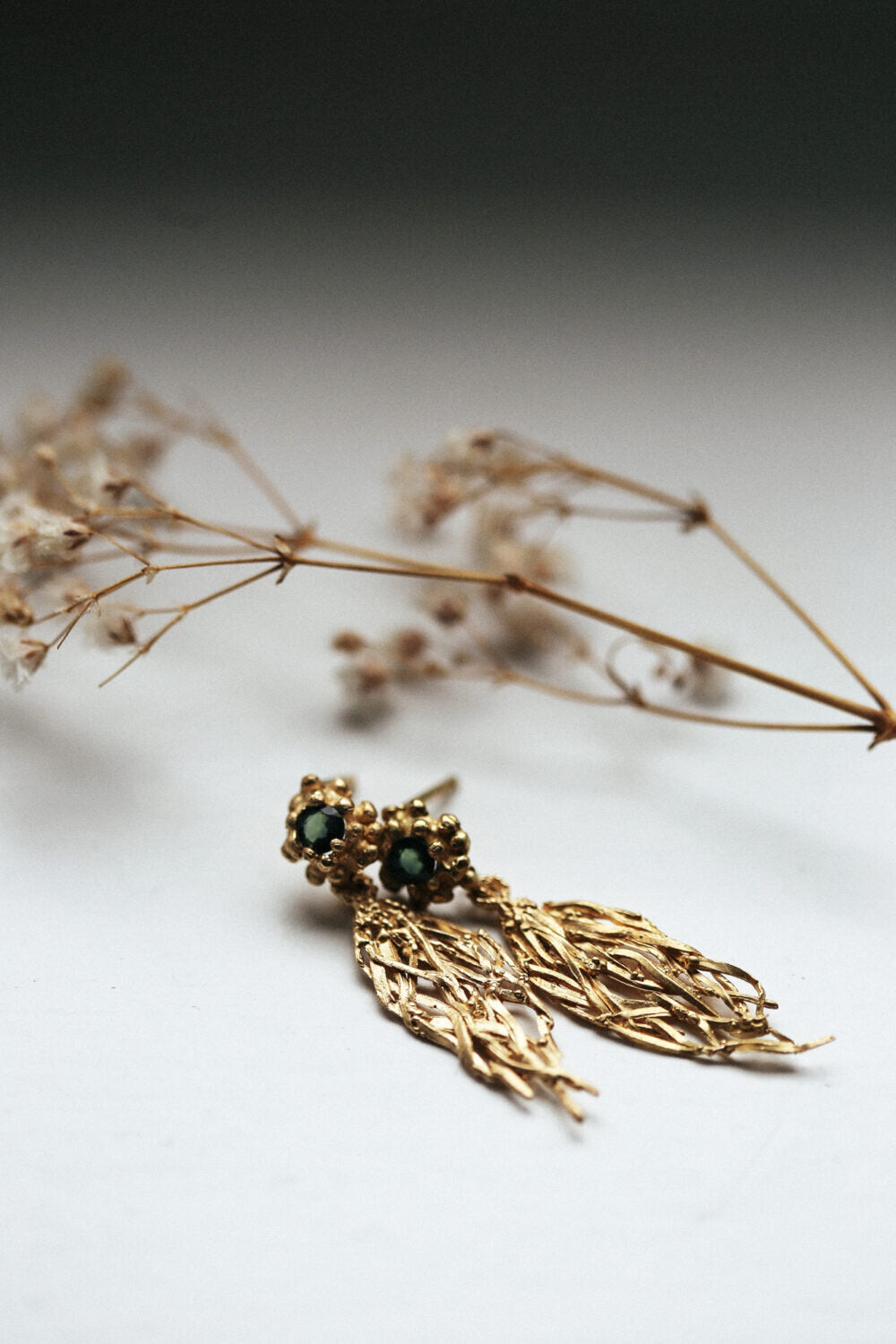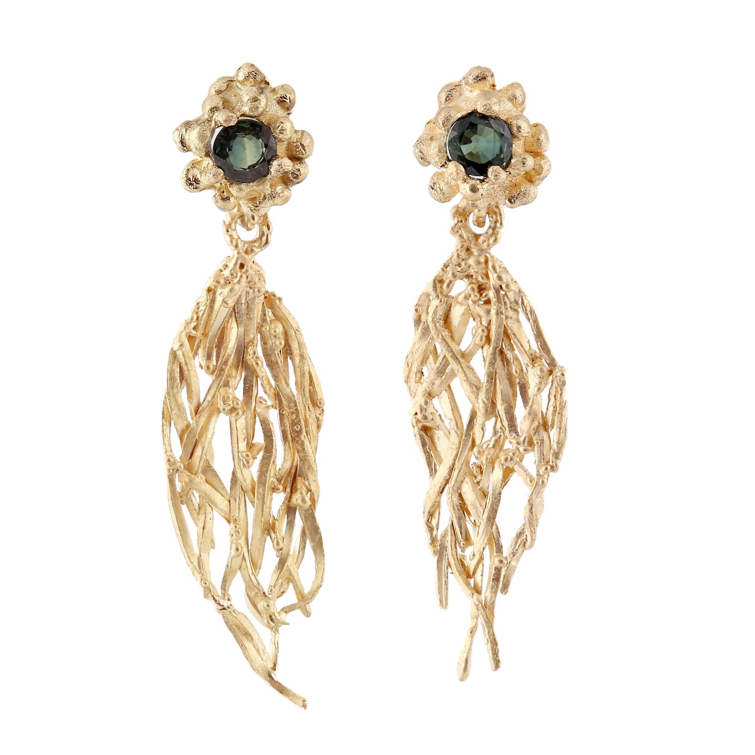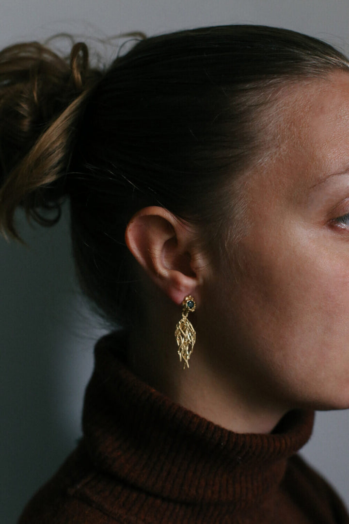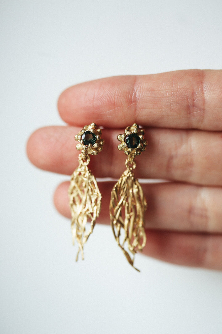 Dovile's Sirens collection is inspired by the Greek epic poem of Homer - The Odyssey. Particularly by the scene were Odysseus meets seductive Sirens, beautiful but dangerous creatures who lured sailors to shipwreck with their songs. The notion of love conquering fear is so strong in this poem and inspired Dovile to make this dreamy collection. These intricate statement earrings are made in 18k gold with round teal sapphires sunken into coral textured studs. The seaweeds are carefully cut and arranged by hand to create feather-like shapes representing the wings of the enchanting sirens.
