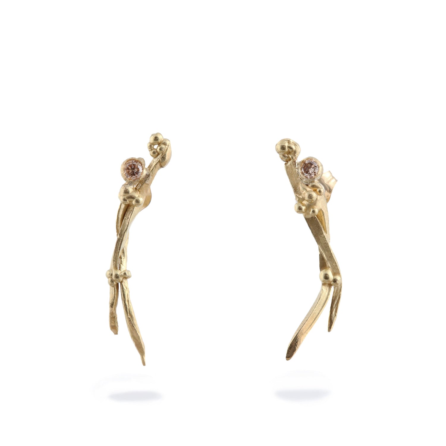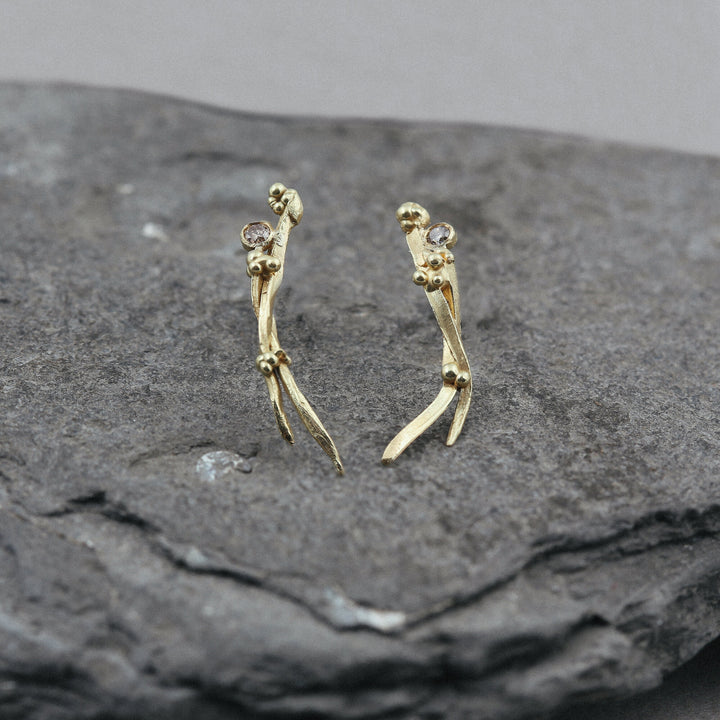 Dovile's dreamy Sirens collection consists of jewels lost and discovered, hidden deep under the water within the tangled seaweeds and undergrowth corals. Seaweeds growing from bubbles tangle around each other to make these curvy stud earrings. Each earring is slightly different from each other – perfectly imperfect – just like seaweeds in real life. Hand sculpted from wax, these earrings have this natural feeling to them and a little sparkle added by muted champagne coloured diamonds.