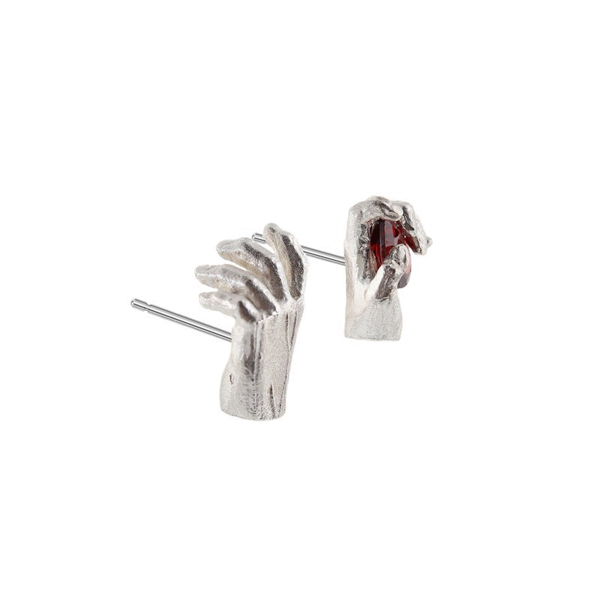 Dovile's Hand collection celebrates love in an unconventional way and creates strong emotions for the wearer. These magical and slightly dark jewels transport the wearer through the divine essence of passion and affection. One of these mismatched earrings hold a pear cut red garnet while the other one is turned back to 'hold' the earlobe. The gemstone held in the hand represents the heart, therefore, these earrings make a perfect present for the loved one.