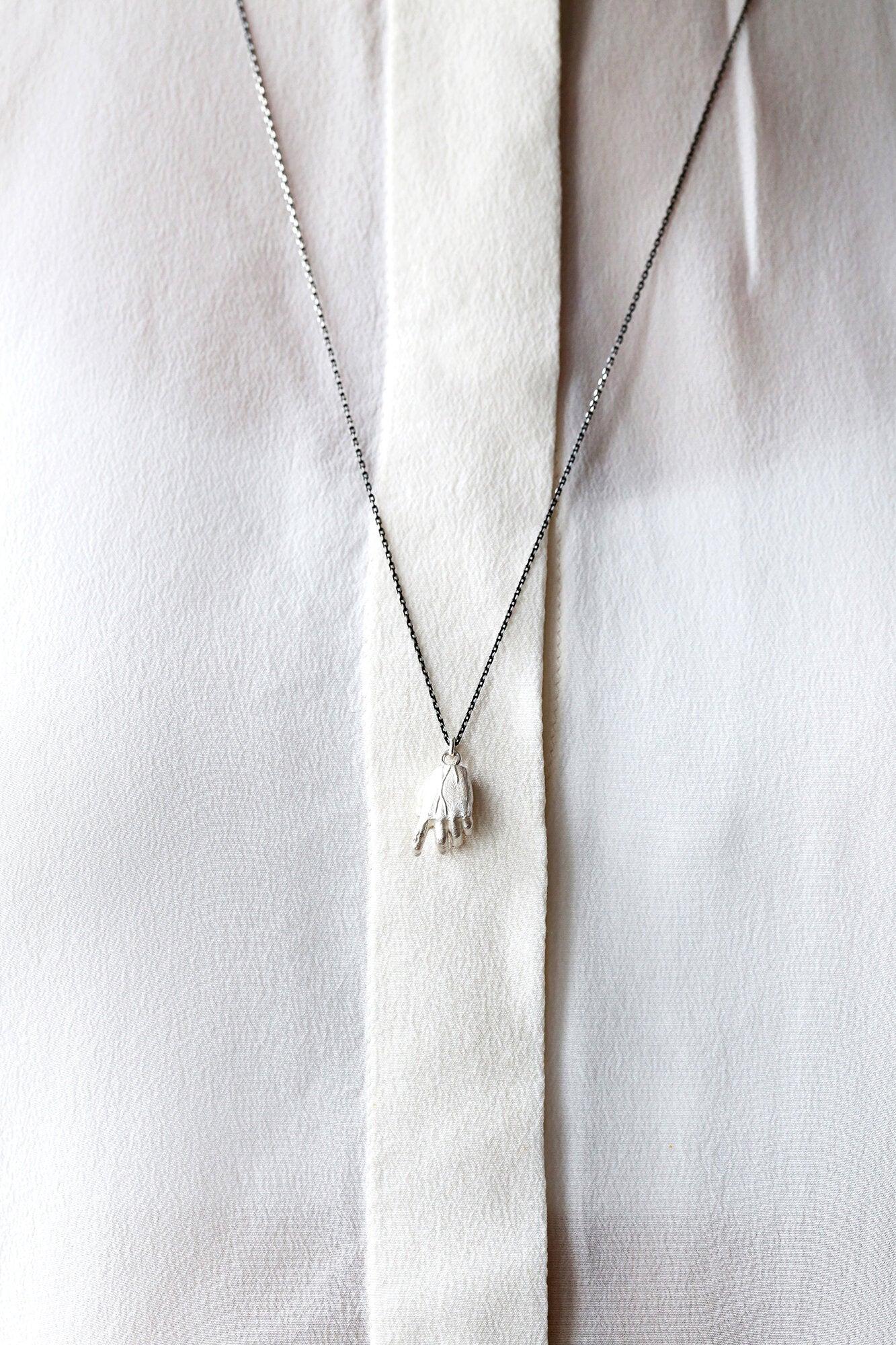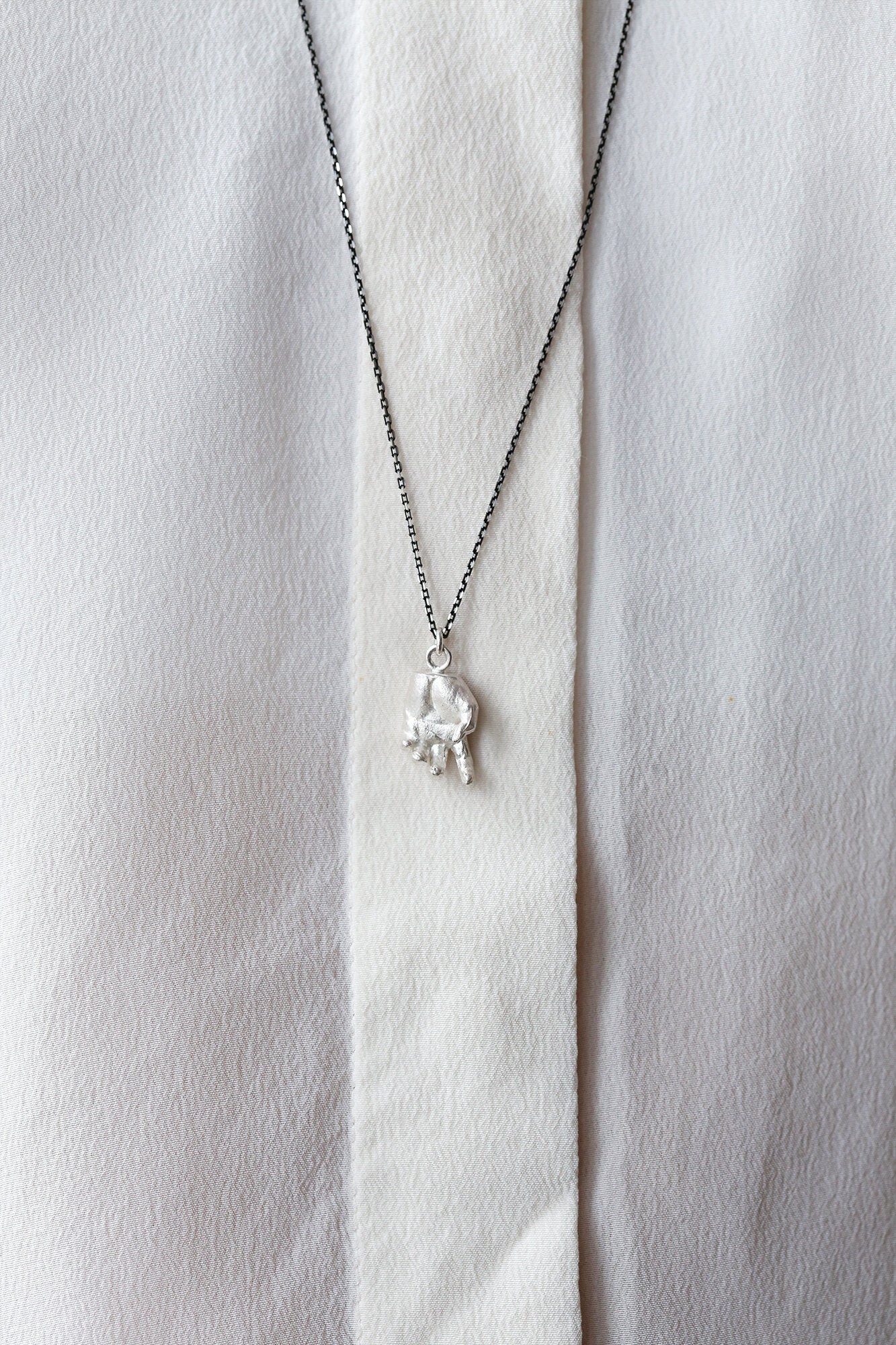 Recycled sterling silver with a black rhodium plated silver chain.Dimensions: The hand is approx. 13mm x 10mm x 7mm. The chain is 30 inches.
