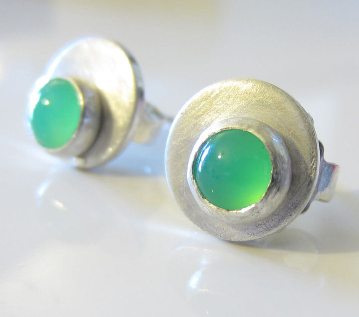 Sterling silver with green chrysoprase cabochon gemstones. The ear posts are made of sterling silver with butterfly scrolls.Dimensions: These round ear studs are about 1 cm - 1/2 inch wide, the gemstones are 6 mm wide.